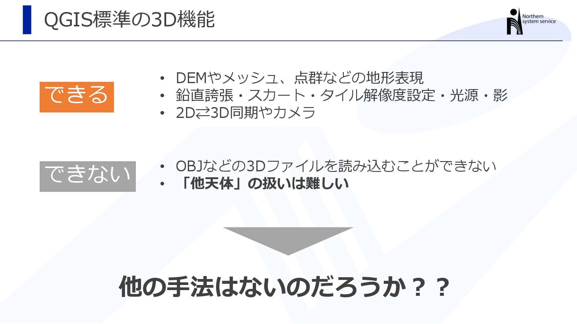 QGISには3D機能がデフォルトでついていますが、専門的な要件には使いずらい場面もあり、カスタムな3D表現が可能なPlugin開発手法についてご紹介します。 また、今回はCodex CLI やClaude Code等を使用した"Vibe Coding"(雰囲気コーディング)をメインとして開発しておりましたので、GIS開発などの実務におけるAI駆動開発のTIPSなどもお話いたします。