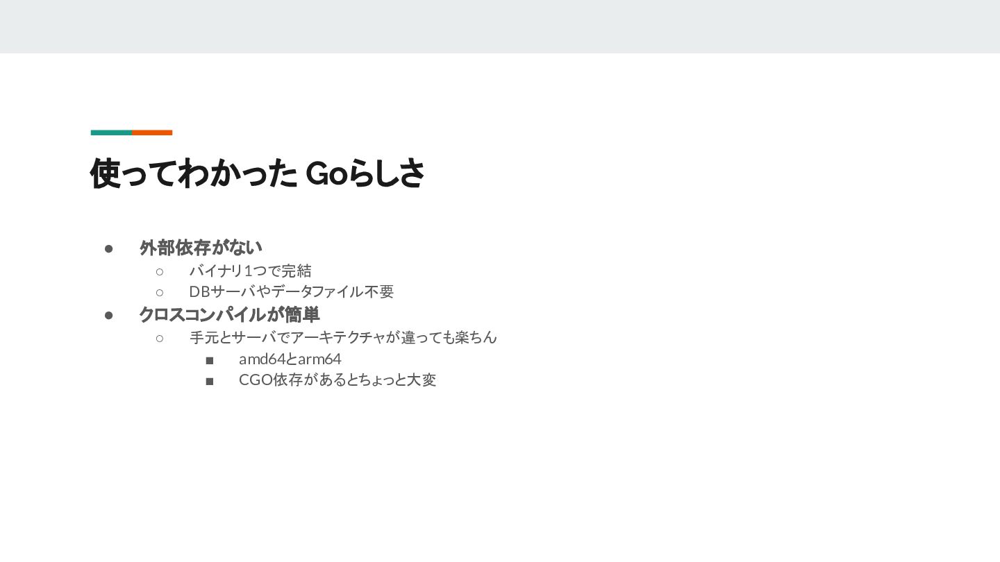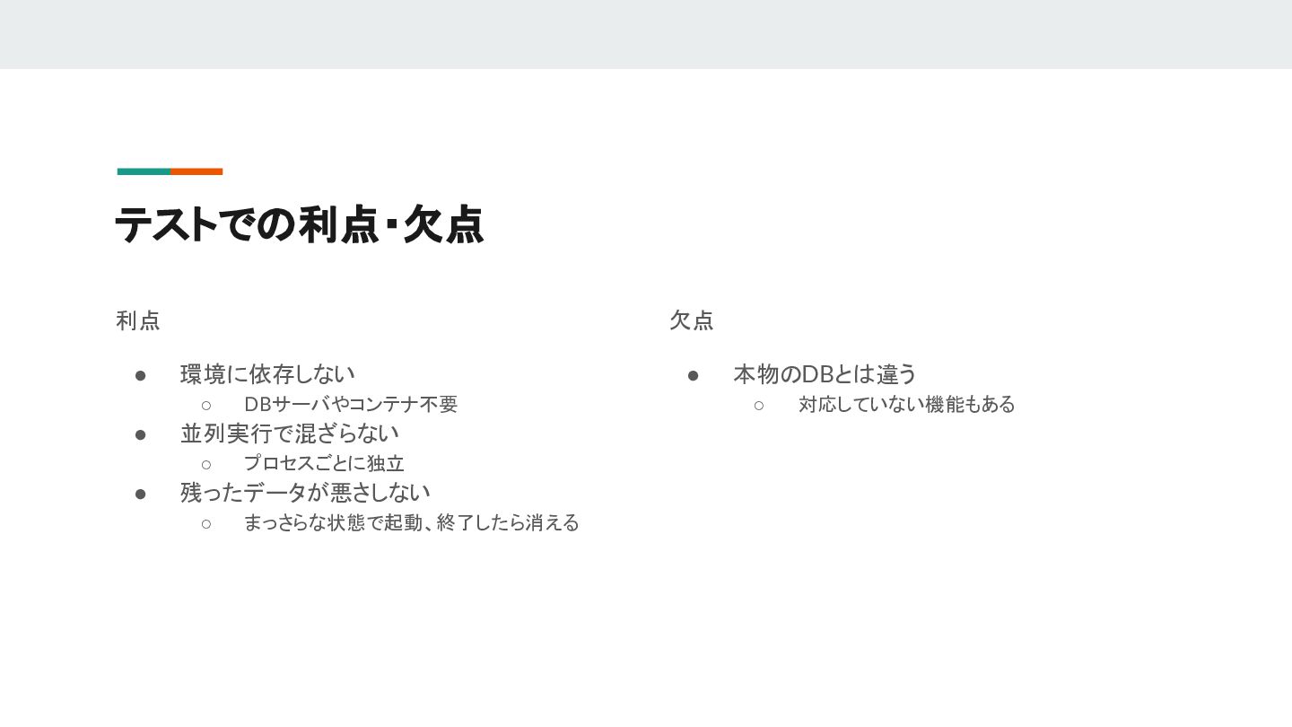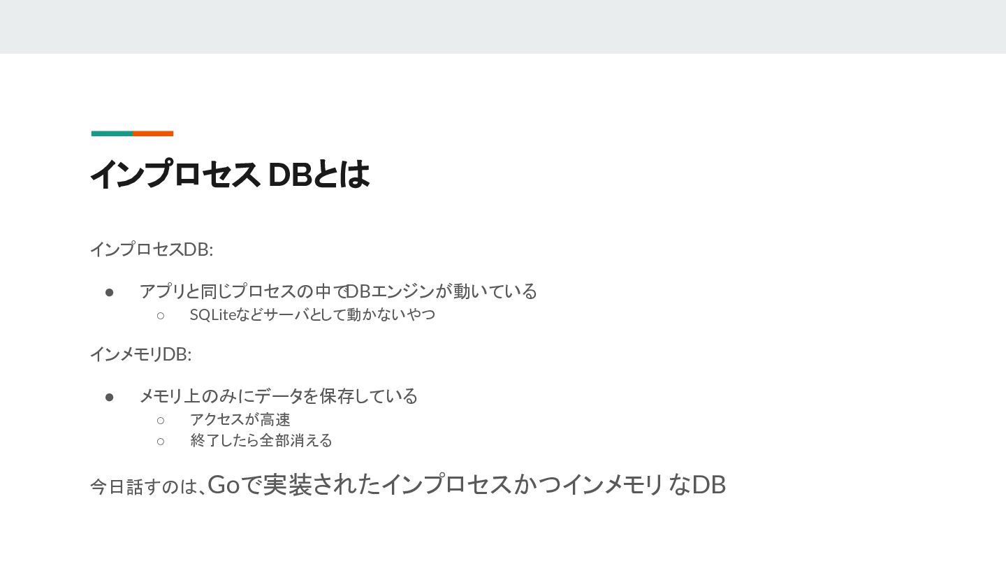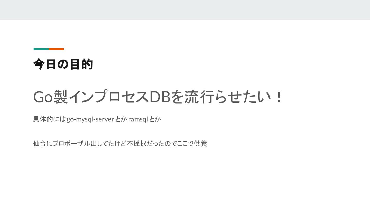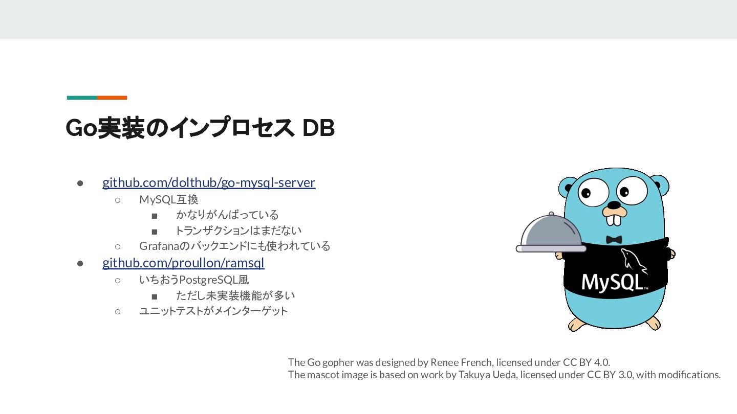 ◦ Grafanaのバックエンドにも使われている • github.com/proullon/ramsql ◦ いちおうPostgreSQL風 ▪ ただし未実装機能が多い ◦ ユニットテストがメインターゲット The Go gopher was designed by Renee French, licensed under CC BY 4.0. The mascot image is based on work by Takuya Ueda, licensed under CC BY 3.0, with modifications.