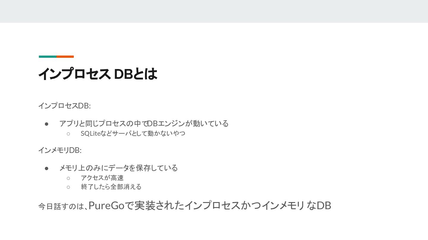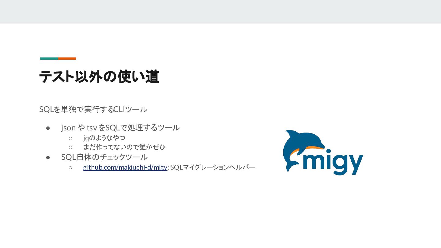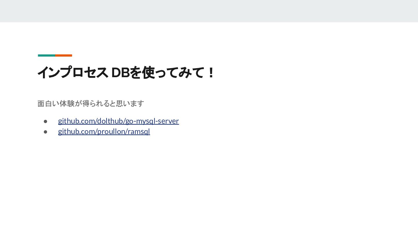 ◦ Grafanaのバックエンドにも使われている • github.com/proullon/ramsql ◦ いちおうPostgreSQL風 ▪ ただし未実装機能が多い ◦ ユニットテストがメインターゲット The Go gopher was designed by Renee French, licensed under CC BY 4.0. The mascot image is based on work by Takuya Ueda, licensed under CC BY 3.0, with modifications.