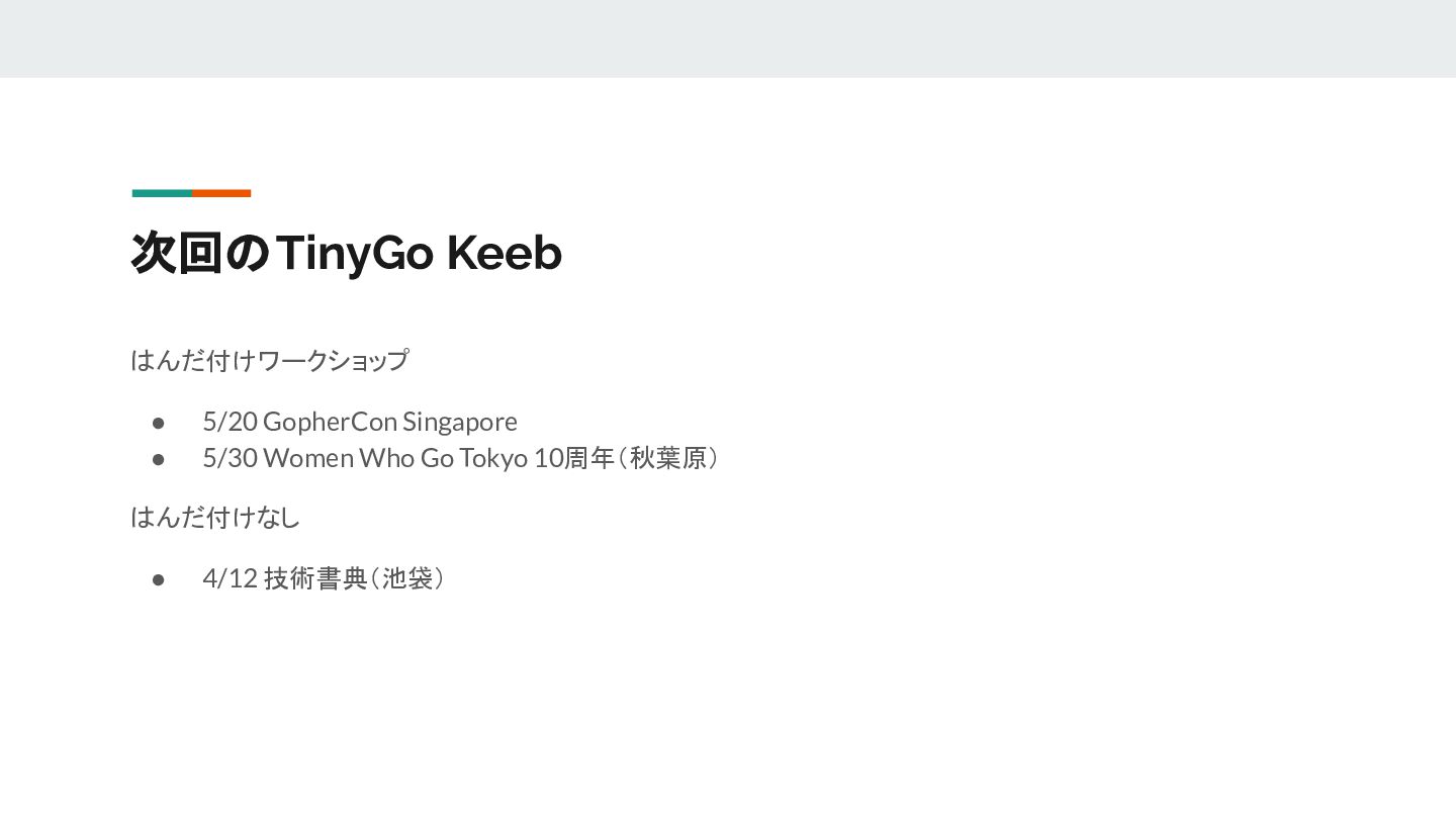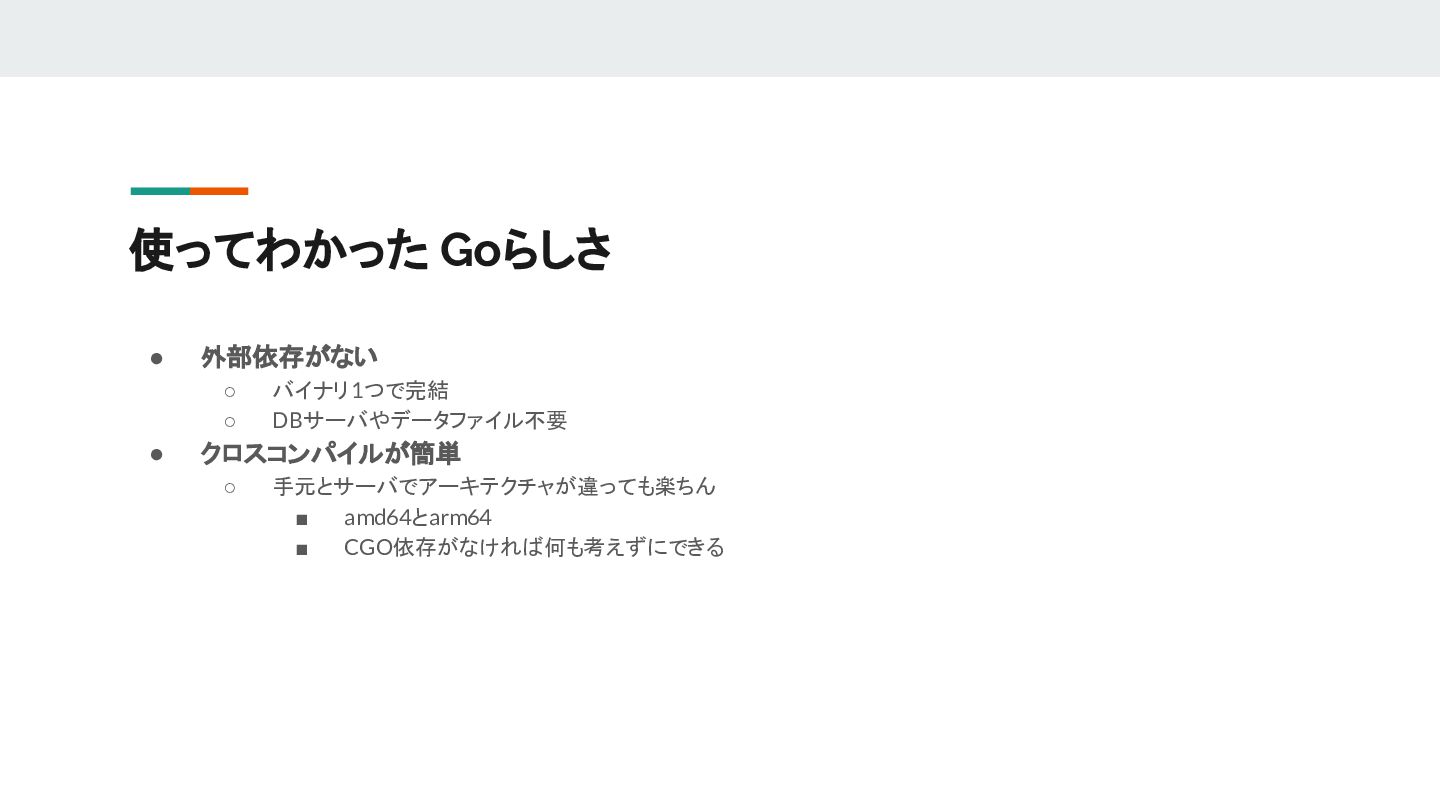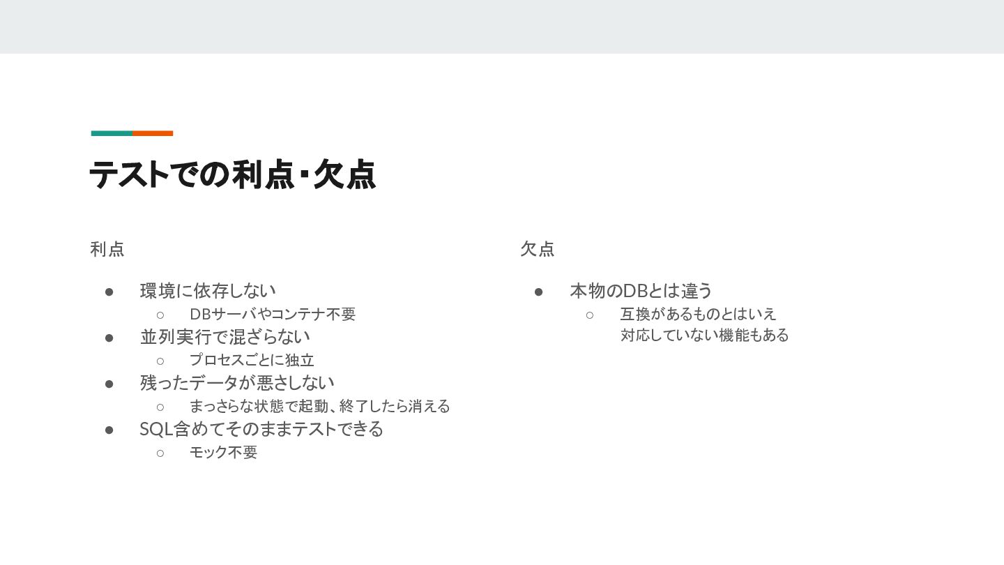 ◦ Grafanaのバックエンドにも使われている • github.com/proullon/ramsql ◦ いちおうPostgreSQL風 ▪ ただし未実装機能が多い ◦ ユニットテストがメインターゲット The Go gopher was designed by Renee French, licensed under CC BY 4.0. The mascot image is based on work by Takuya Ueda, licensed under CC BY 3.0, with modifications.