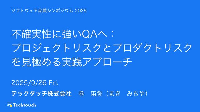 不確実性に強いQAへ: プロジェクトリスクとプロダクトリスク を見極める実践アプローチ テックタッチ株式会社 巻 宙弥(まき みちや) ソフトウェア品質シンポジウム 2025 2025/9/26 Fri.