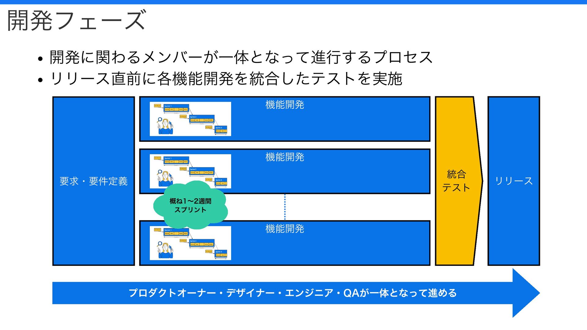 リリース直前に各機能開発を統合したテストを実施 概ね1〜2週間 スプリント