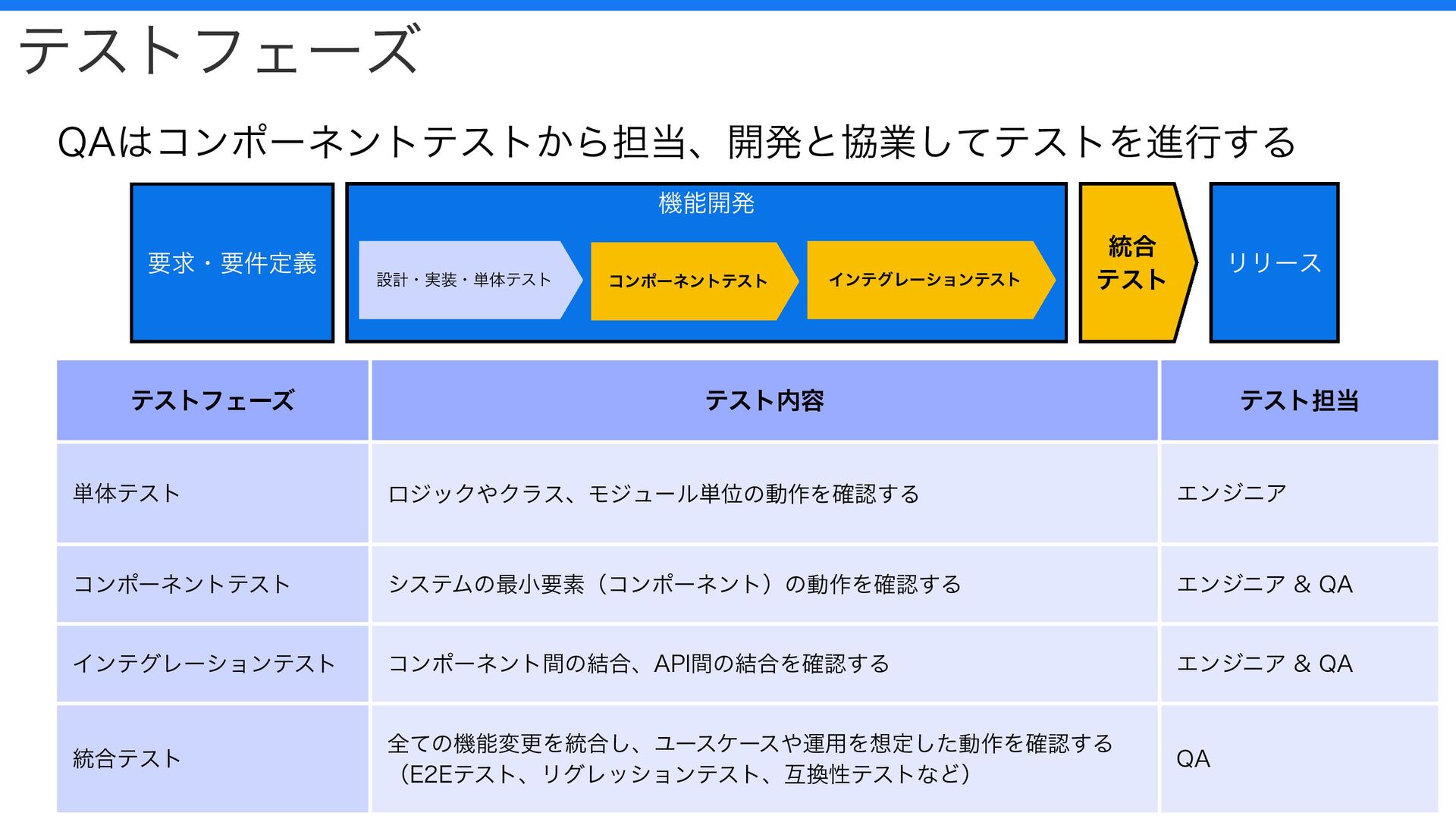 テスト担当 単体テスト ロジックやクラス、モジュール単位の動作を確認する エンジニア コンポーネントテスト システムの最小要素(コンポーネント)の動作を確認する エンジニア & QA インテグレーションテスト コンポーネント間の結合、API間の結合を確認する エンジニア & QA 統合テスト 全ての機能変更を統合し、ユースケースや運用を想定した動作を確認する (E2Eテスト、リグレッションテスト、互換性テストなど) QA テストフェーズ QAはコンポーネントテストから担当、開発と協業してテストを進行する