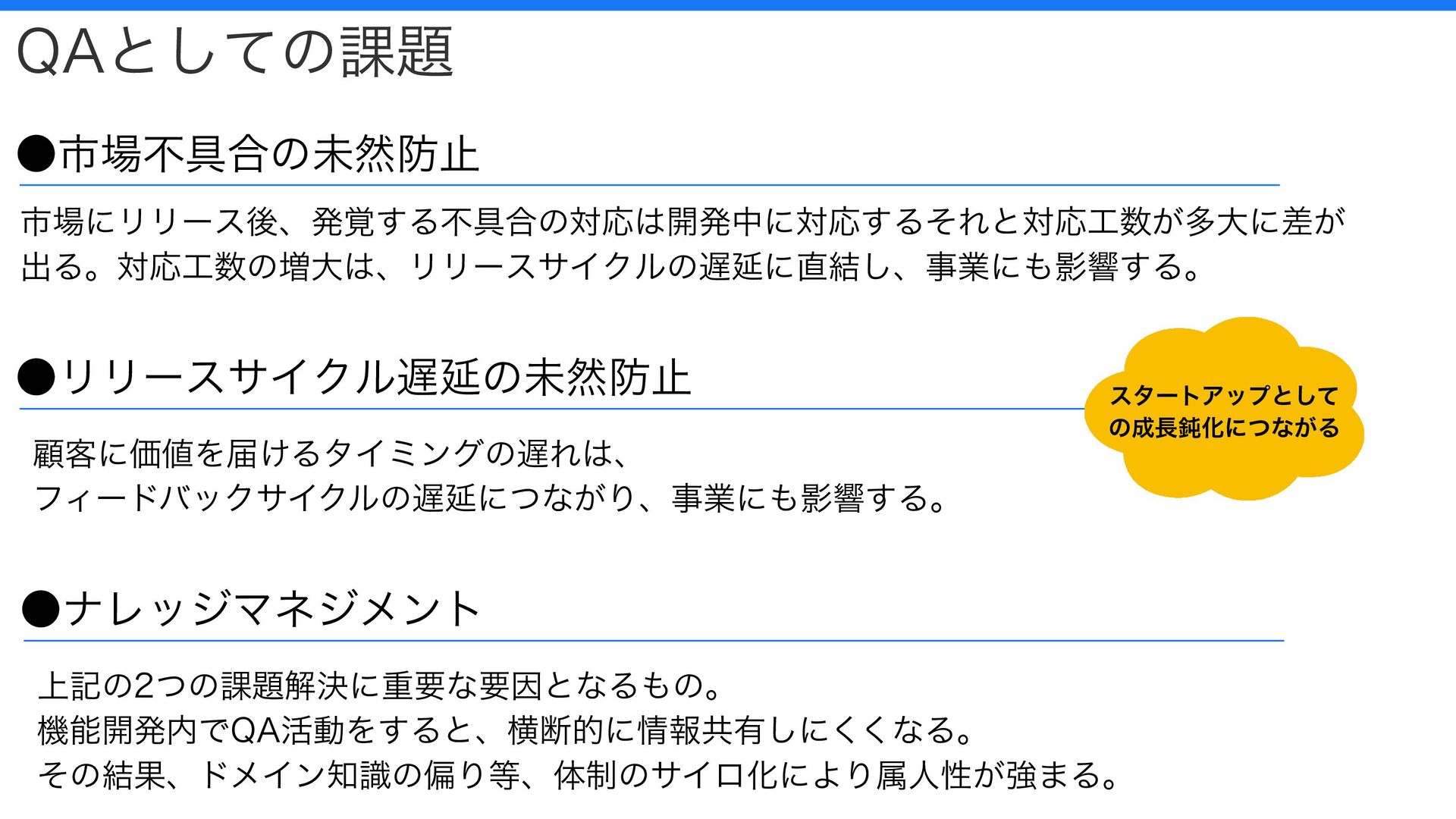 QAとしての課題 市場にリリース後、発覚する不具合の対応は開発中に対応するそれと対応工数が多大に差が 出る。対応工数の増大は、リリースサイクルの遅延に直結し、事業にも影響する。 顧客に価値を届けるタイミングの遅れは、 フィードバックサイクルの遅延につながり、事業にも影響する。 •市場不具合の未然防止 •リリースサイクル遅延の未然防止 上記の2つの課題解決に重要な要因となるもの。 機能開発内でQA活動をすると、横断的に情報共有しにくくなる。 その結果、ドメイン知識の偏り等、体制のサイロ化により属人性が強まる。