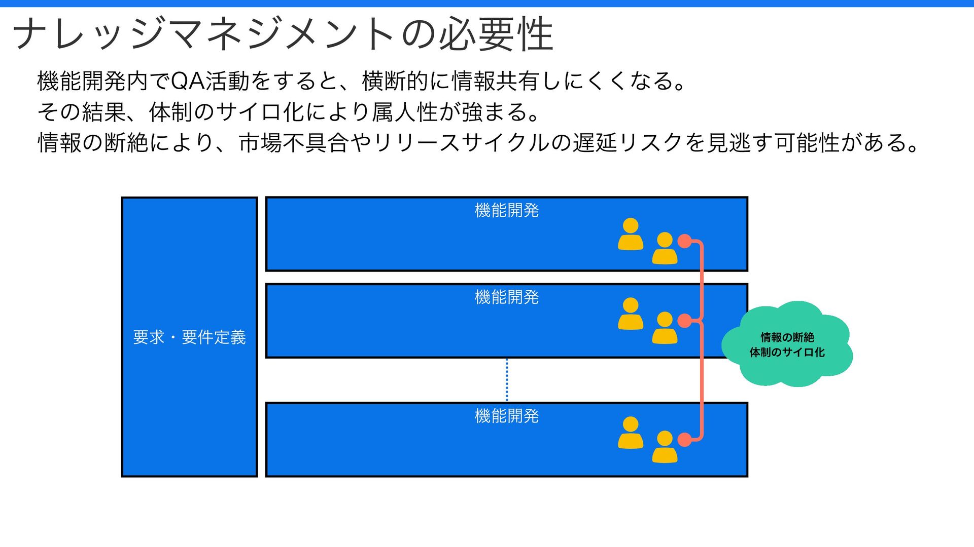 ナレッジマネジメントの必要性 機能開発内でQA活動をすると、横断的に情報共有しにくくなる。 その結果、体制のサイロ化により属人性が強まる。 情報の断絶により、市場不具合やリリースサイクルの遅延リスクを見逃す可能性がある。 機能開発 機能開発 機能開発 要求・要件定義 情報の断絶 体制のサイロ化