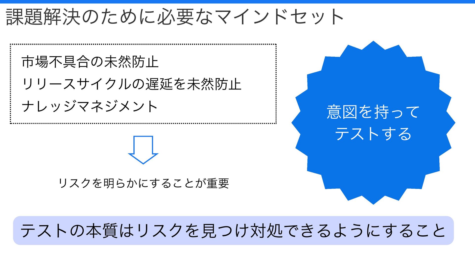 意図を持って テストする 課題解決のために必要なマインドセット 市場不具合の未然防止 リリースサイクルの遅延を未然防止 ナレッジマネジメント リスクを明らかにすることが重要 テストの本質はリスクを見つけ対処できるようにすること