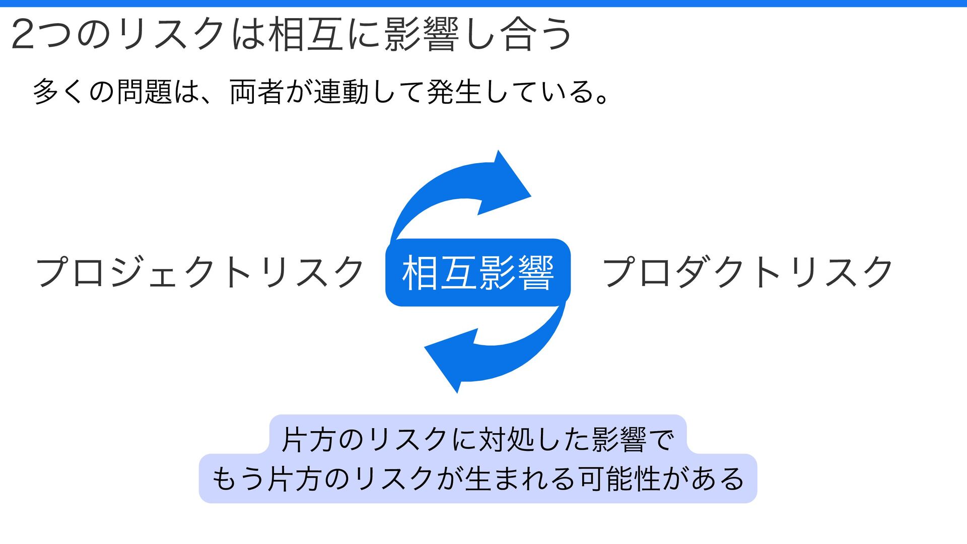 プロジェクトリスク プロダクトリスク 2つのリスクは相互に影響し合う 相互影響 多くの問題は、両者が連動して発生している。 片方のリスクに対処した影響で もう片方のリスクが生まれる可能性がある