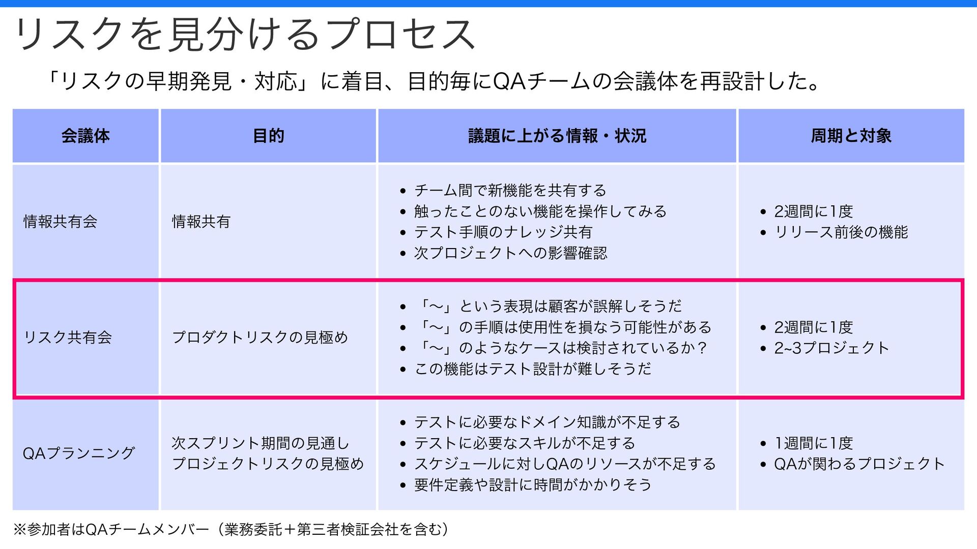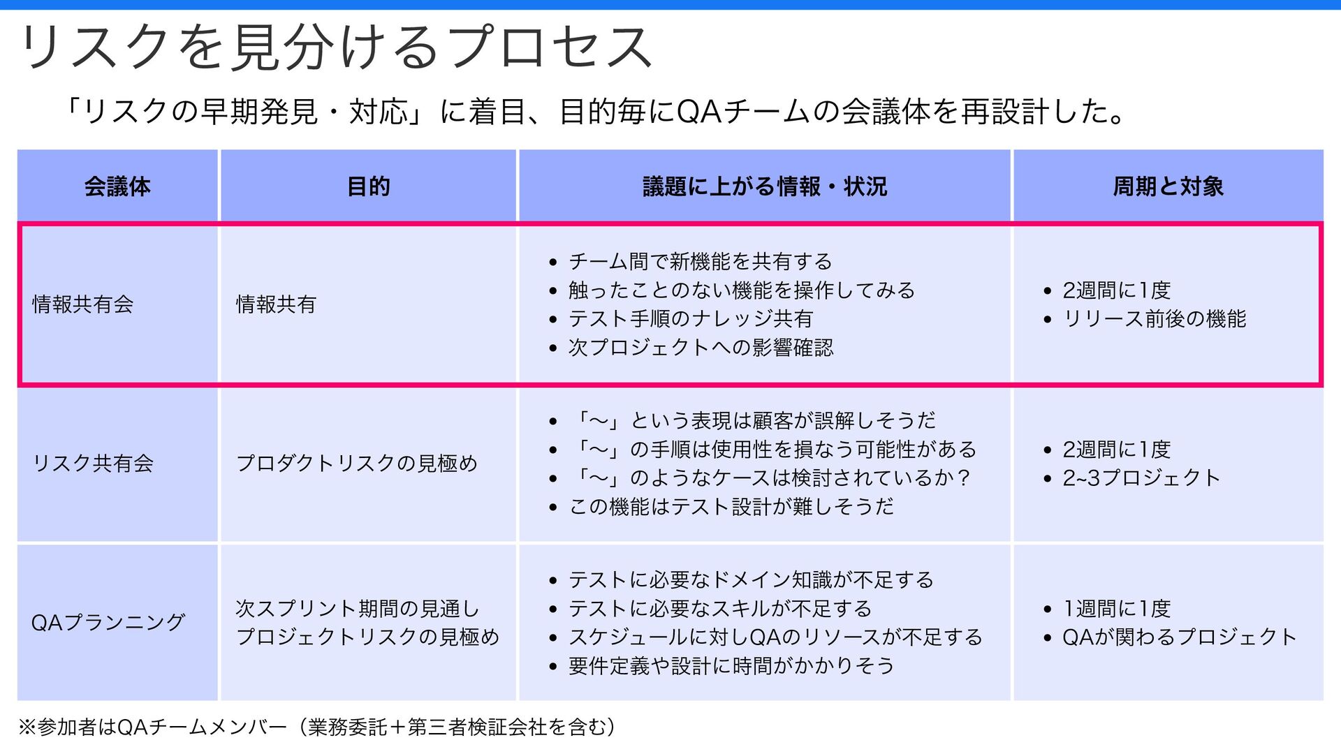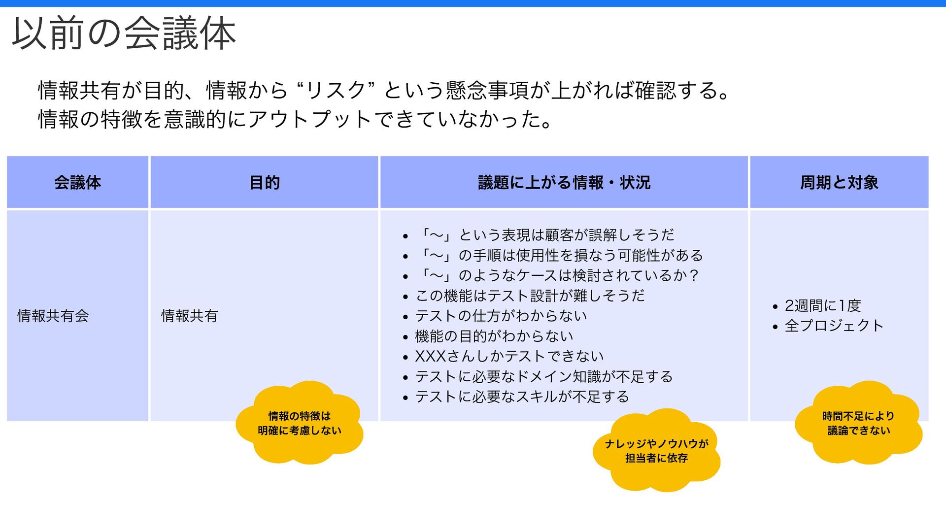 テストの仕方がわからない 機能の目的がわからない XXXさんしかテストできない テストに必要なドメイン知識が不足する テストに必要なスキルが不足する 2週間に1度 全プロジェクト 以前の会議体 情報共有が目的、情報から “リスク” という懸念事項が上がれば確認する。 情報の特徴を意識的にアウトプットできていなかった。 時間不足により 議論できない ナレッジやノウハウが 担当者に依存 情報の特徴は 明確に考慮しない