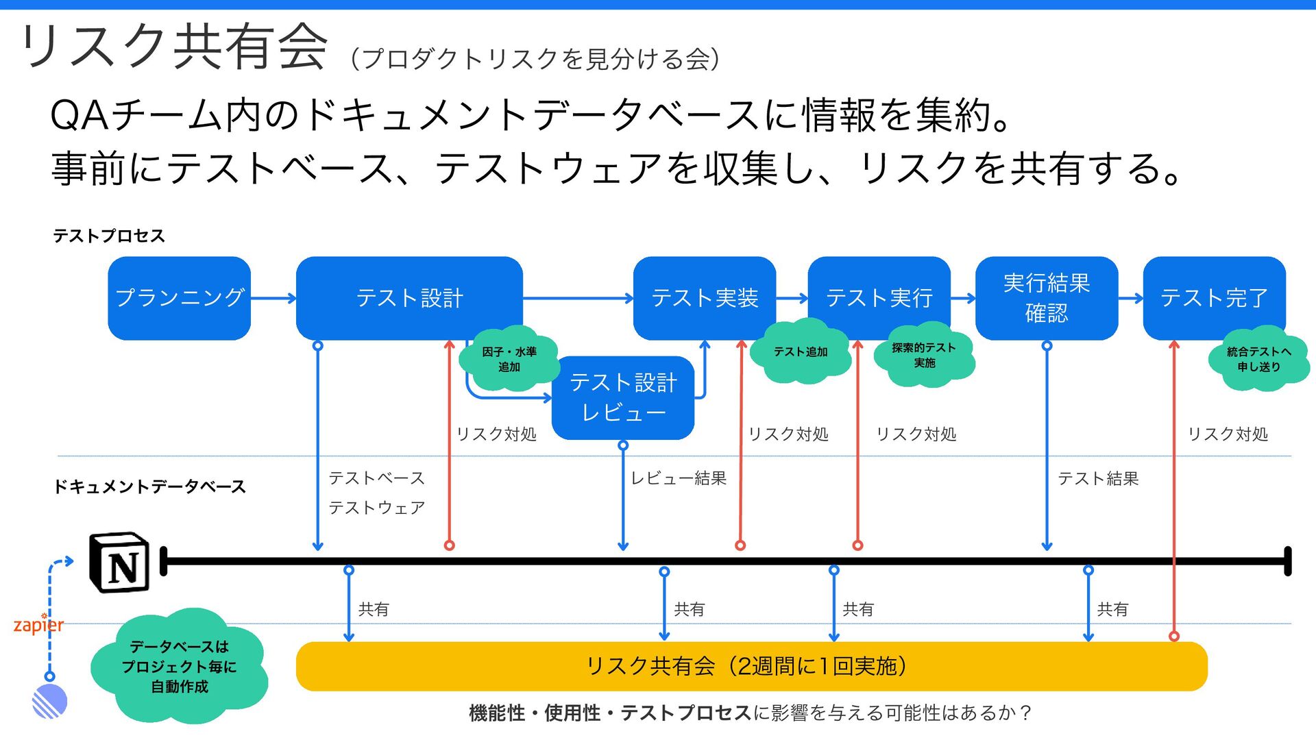 テストプロセス リスク共有会(2週間に1回実施) データベースは プロジェクト毎に 自動作成 レビュー結果 テスト結果 統合テストへ 申し送り 探索的テスト 実施 テスト追加 因子・水準 追加 機能性・使用性・テストプロセスに影響を与える可能性はあるか? リスク共有会(プロダクトリスクを見分ける会) QAチーム内のドキュメントデータベースに情報を集約。 事前にテストベース、テストウェアを収集し、リスクを共有する。 テストベース テストウェア 共有 共有 共有 共有 リスク対処 リスク対処 リスク対処 リスク対処