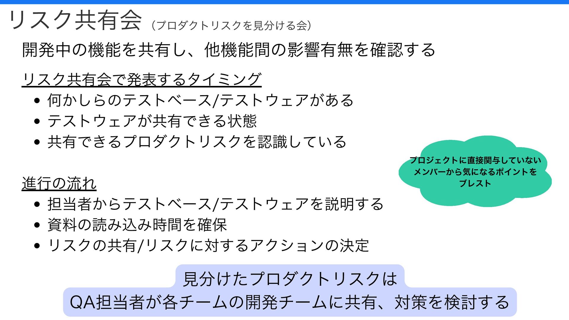 リスク共有会 開発中の機能を共有し、他機能間の影響有無を確認する リスク共有会で発表するタイミング 何かしらのテストベース/テストウェアがある テストウェアが共有できる状態 共有できるプロダクトリスクを認識している 進行の流れ 担当者からテストベース/テストウェアを説明する 資料の読み込み時間を確保 リスクの共有/リスクに対するアクションの決定