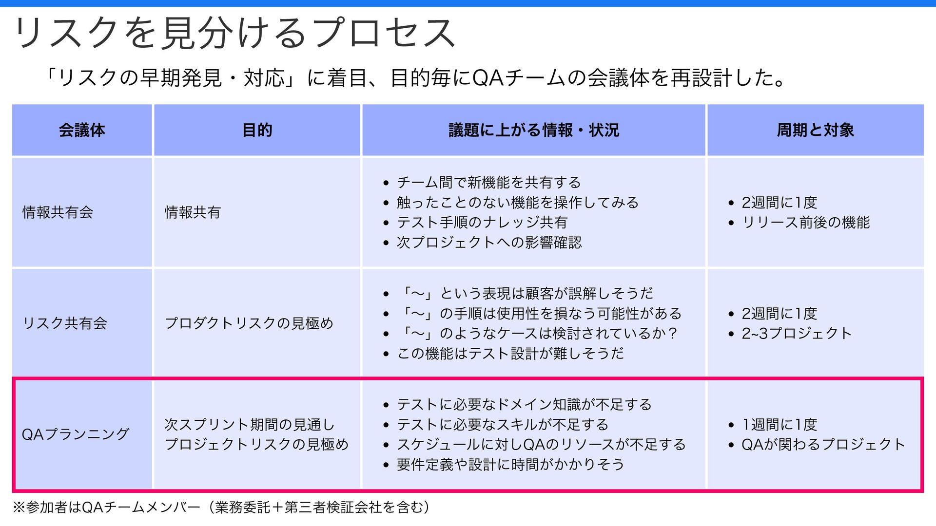 2週間に1度 リリース前後の機能 リスク共有会 プロダクトリスクの見極め 「〜」という表現は顧客が誤解しそうだ 「〜」の手順は使用性を損なう可能性がある 「〜」のようなケースは検討されているか? この機能はテスト設計が難しそうだ 2週間に1度 2~3プロジェクト QAプランニング 次スプリント期間の見通し プロジェクトリスクの見極め テストに必要なドメイン知識が不足する テストに必要なスキルが不足する スケジュールに対しQAのリソースが不足する 要件定義や設計に時間がかかりそう 1週間に1度 QAが関わるプロジェクト リスクを見分けるプロセス 「リスクの早期発見・対応」に着目、目的毎にQAチームの会議体を再設計した。 ※参加者はQAチームメンバー(業務委託+第三者検証会社を含む)