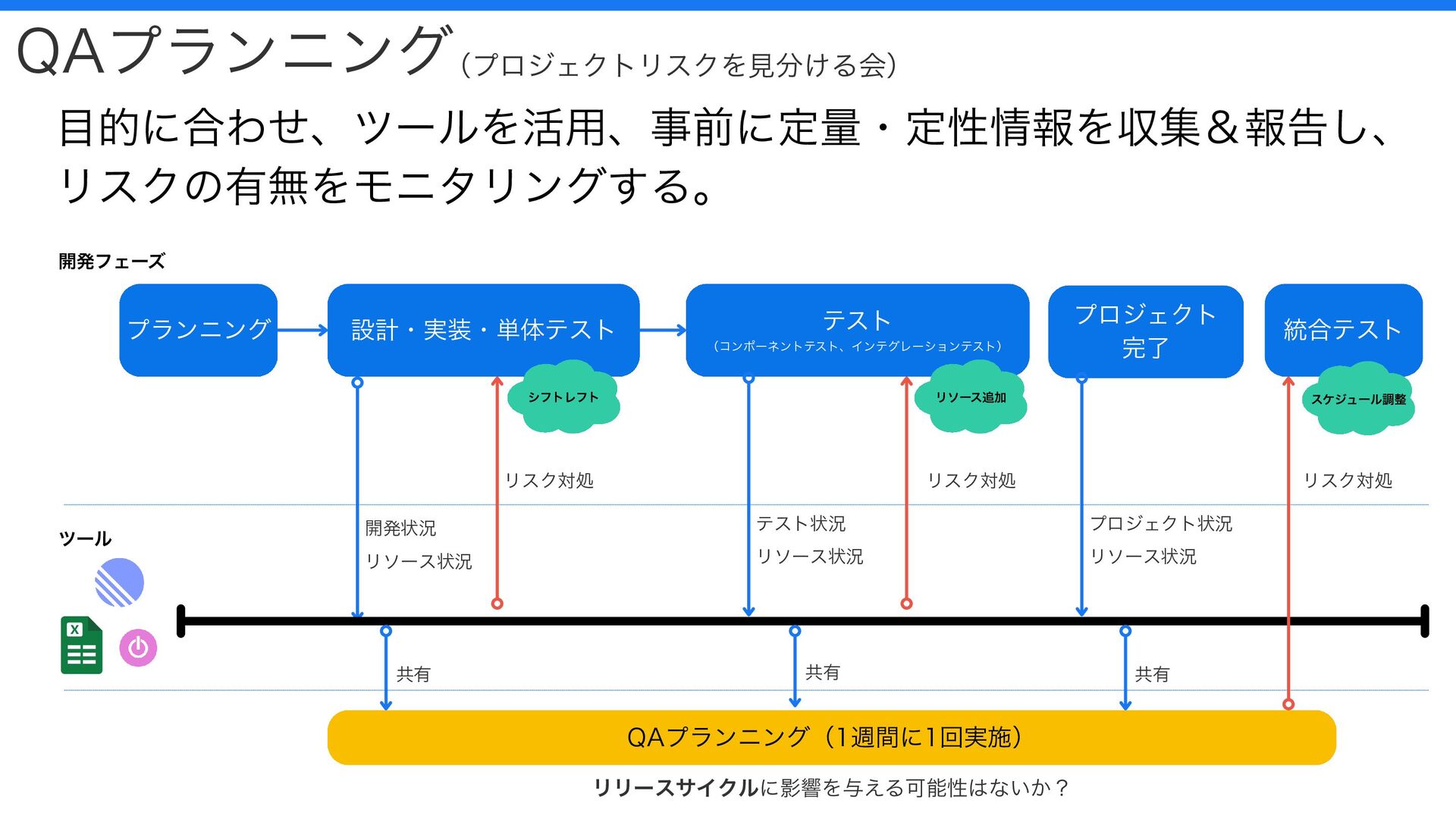 シフトレフト リソース追加 スケジュール調整 リリースサイクルに影響を与える可能性はないか? QAプランニング(プロジェクトリスクを見分ける会) 目的に合わせ、ツールを活用、事前に定量・定性情報を収集&報告し、 リスクの有無をモニタリングする。 開発状況 リソース状況 共有 リスク対処 リスク対処 テスト状況 リソース状況 共有 共有 リスク対処 プロジェクト状況 リソース状況