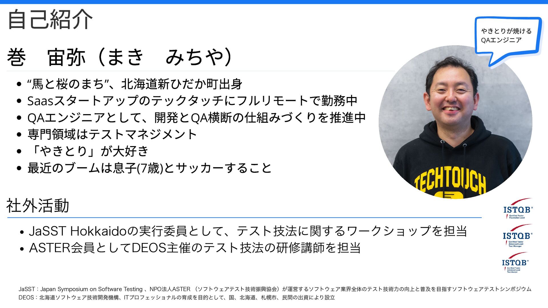 QA エンジニアとして、開発とQA 横断の仕組みづくりを推進中 専門領域はテストマネジメント 「やきとり」が大好き 最近のブームは息子(7 歳) とサッカーすること 社外活動 JaSST Hokkaidoの実行委員として、テスト技法に関するワークショップを担当 ASTER会員としてDEOS主催のテスト技法の研修講師を担当 JaSST:Japan Symposium on Software Testing 、NPO法人ASTER (ソフトウェアテスト技術振興協会)が運営するソフトウェア業界全体のテスト技術力の向上と普及を目指すソフトウェアテストシンポジウム DEOS:北海道ソフトウェア技術開発機構、ITプロフェッショナルの育成を目的として、国、北海道、札幌市、民間の出資により設立