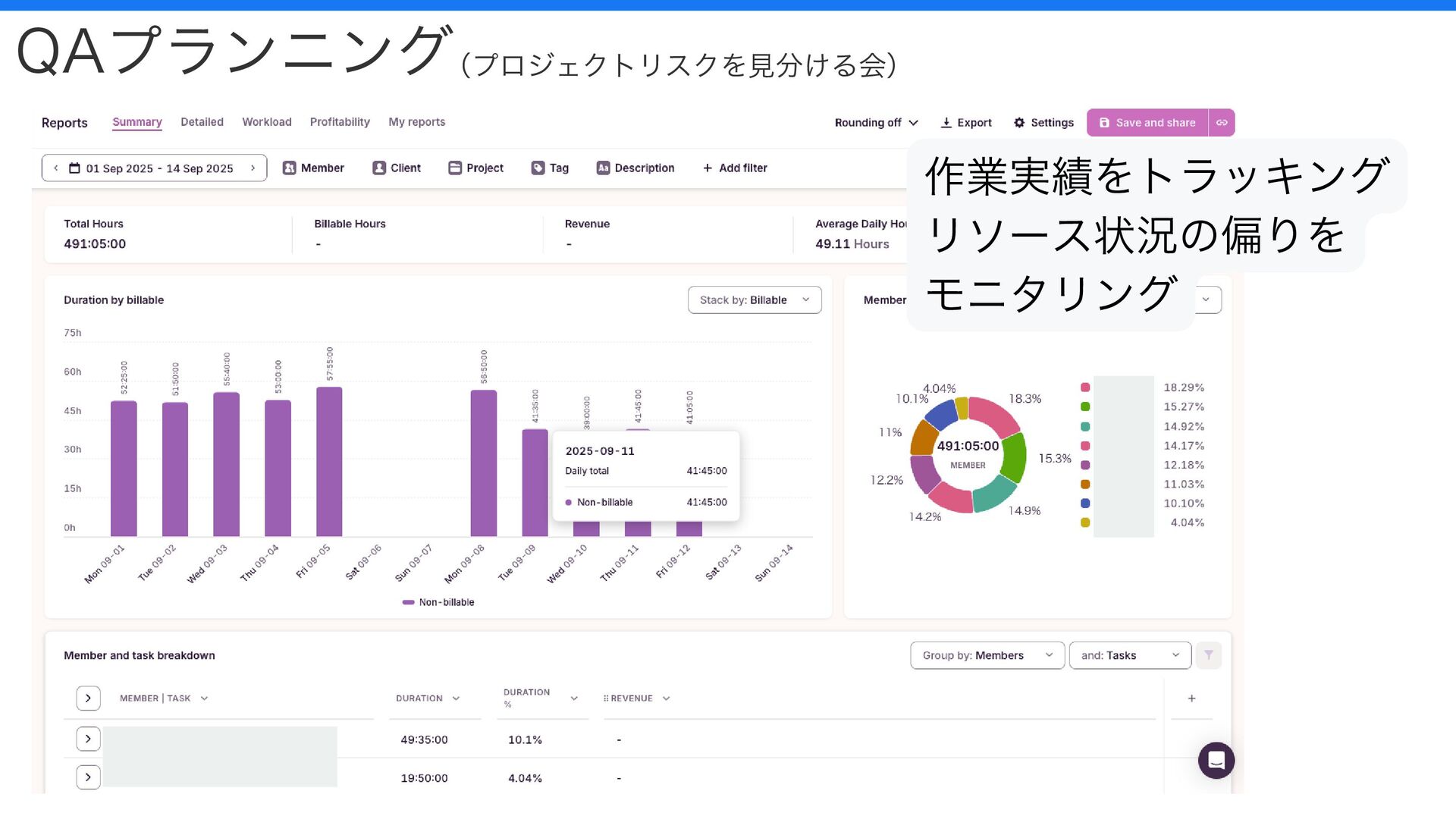 QAプランニング(プロジェクトリスクを見分ける会) 作業実績をトラッキング リソース状況の偏りを モニタリング