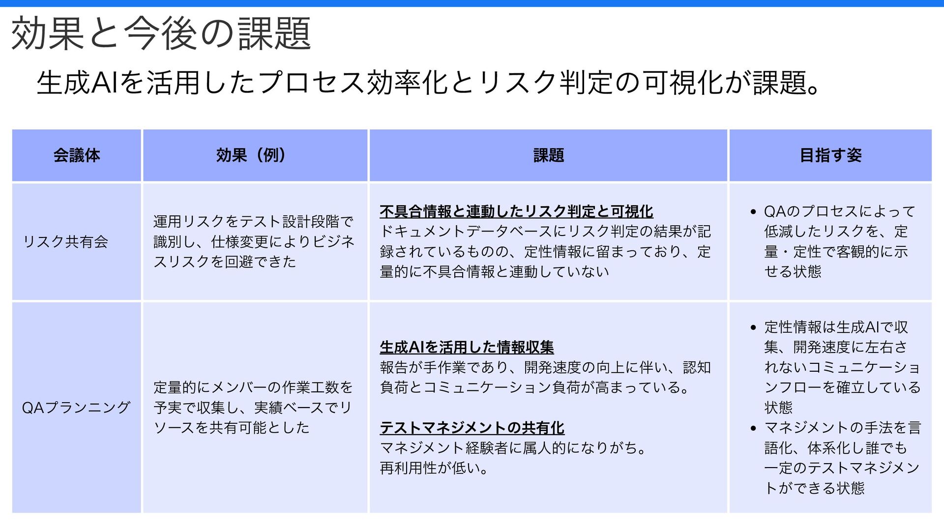 効果と今後の課題 生成AIを活用したプロセス効率化とリスク判定の可視化が課題。 会議体 効果(例) 課題 目指す姿 リスク共有会 運用リスクをテスト設計段階で 識別し、仕様変更によりビジネ スリスクを回避できた