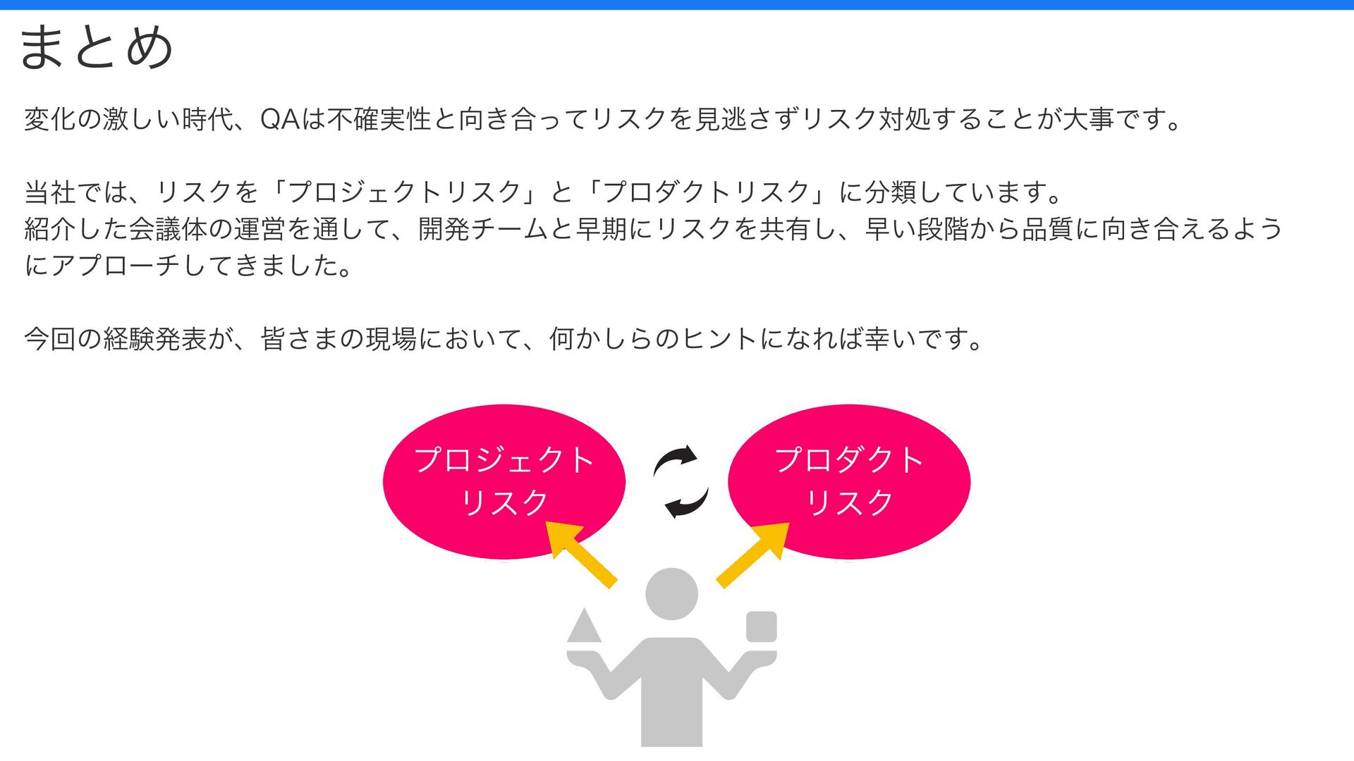 プロジェクト リスク プロダクト リスク まとめ 変化の激しい時代、QAは不確実性と向き合ってリスクを見逃さずリスク対処することが大事です。 当社では、リスクを「プロジェクトリスク」と「プロダクトリスク」に分類しています。 紹介した会議体の運営を通して、開発チームと早期にリスクを共有し、早い段階から品質に向き合えるよう にアプローチしてきました。 今回の経験発表が、皆さまの現場において、何かしらのヒントになれば幸いです。