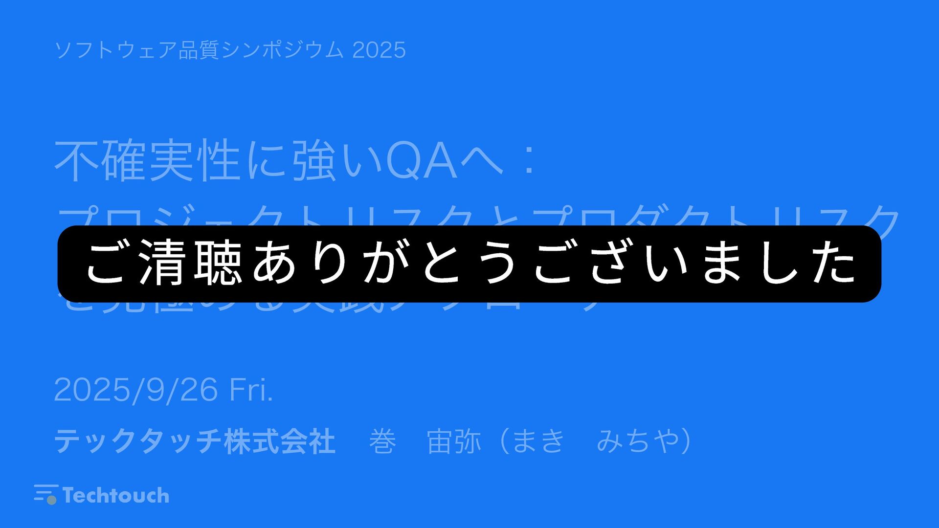 不確実性に強いQAへ: プロジェクトリスクとプロダクトリスク を見極める実践アプローチ テックタッチ株式会社 巻 宙弥(まき みちや) ソフトウェア品質シンポジウム 2025 2025/9/26 Fri. ご清聴ありがとうございました