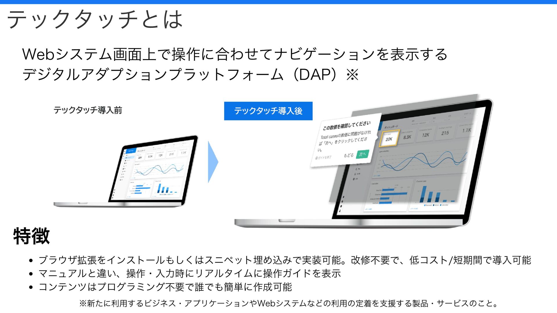 テックタッチとは Webシステム画面上で操作に合わせてナビゲーションを表示する デジタルアダプションプラットフォーム(DAP)※ 特徴 ブラウザ拡張をインストールもしくはスニペット埋め込みで実装可能。改修不要で、低コスト/短期間で導入可能 マニュアルと違い、操作・入力時にリアルタイムに操作ガイドを表示 コンテンツはプログラミング不要で誰でも簡単に作成可能 ※新たに利用するビジネス・アプリケーションやWebシステムなどの利用の定着を支援する製品・サービスのこと。