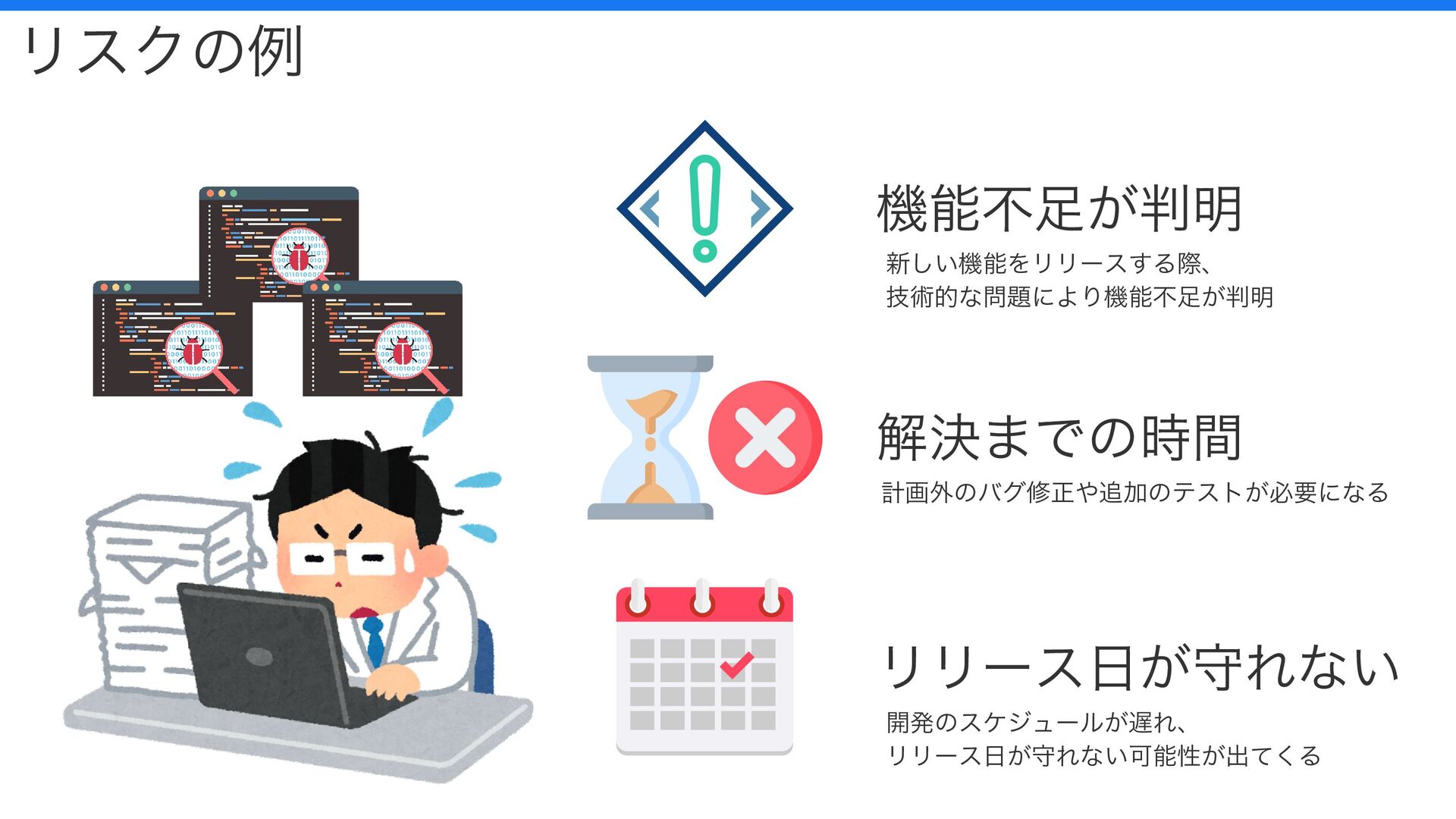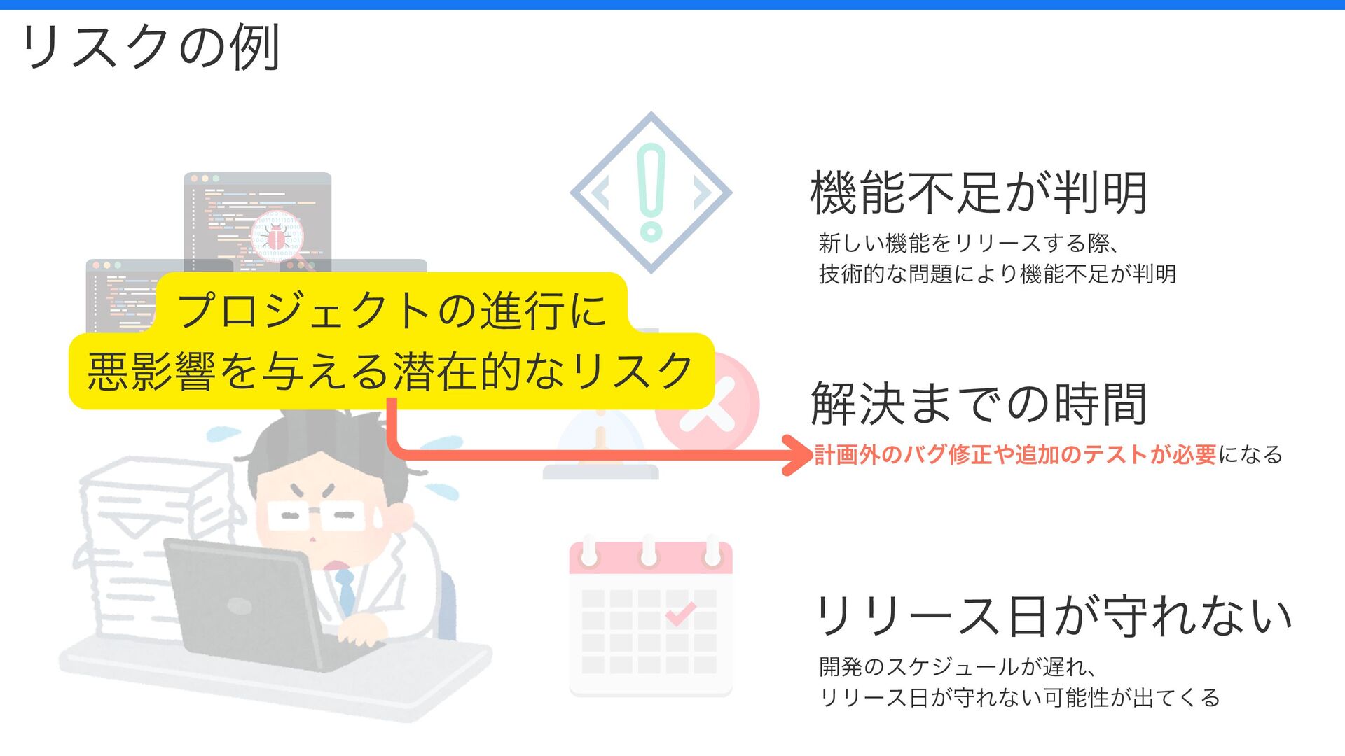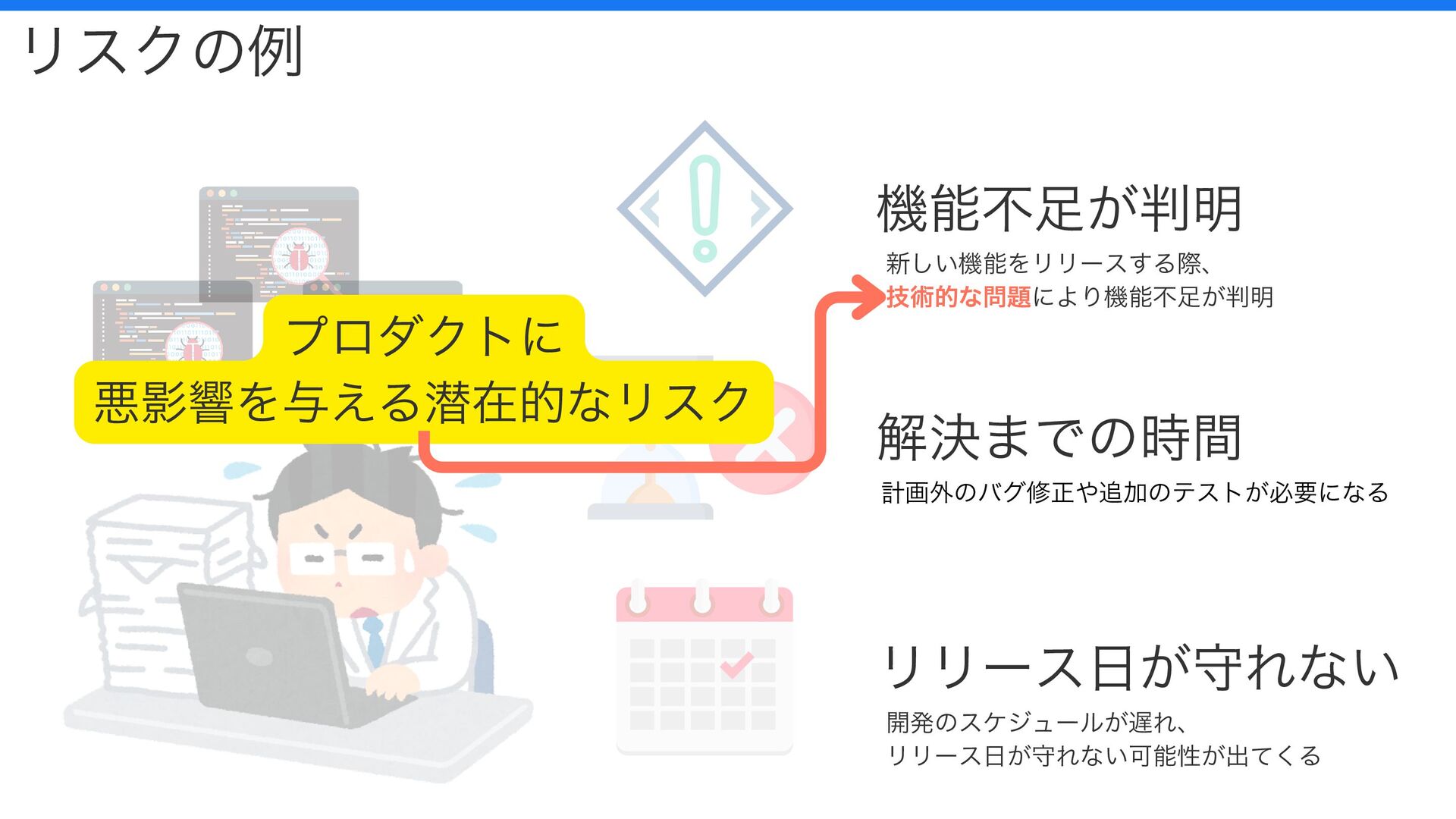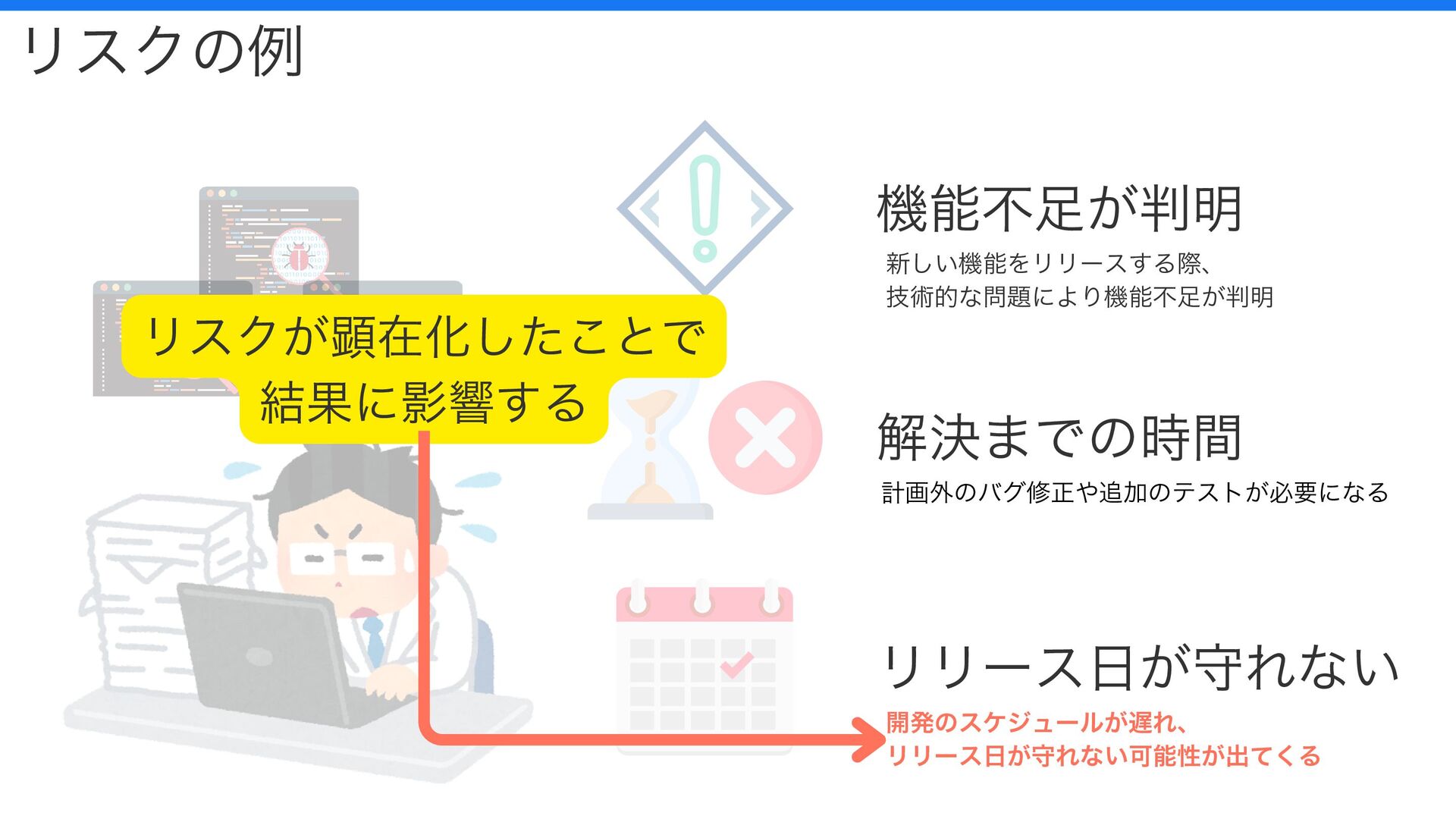 機能不足が判明 解決までの時間 リリース日が守れない リスクの例 新しい機能をリリースする際、 技術的な問題により機能不足が判明 計画外のバグ修正や追加のテストが必要になる 開発のスケジュールが遅れ、 リリース日が守れない可能性が出てくる