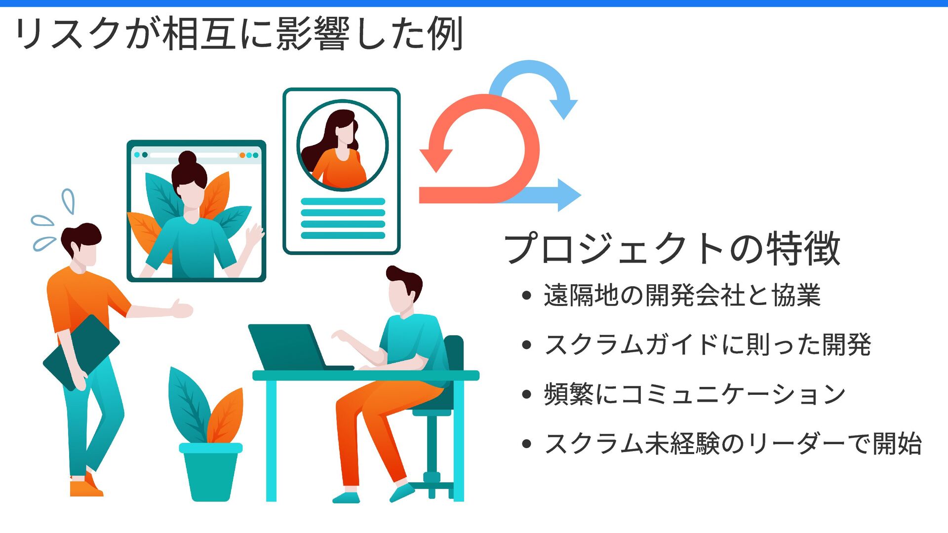 リスクが相互に影響した例 遠隔地の開発会社と協業 スクラムガイドに則った開発 頻繁にコミュニケーション スクラム未経験のリーダーで開始 プロジェクトの特徴