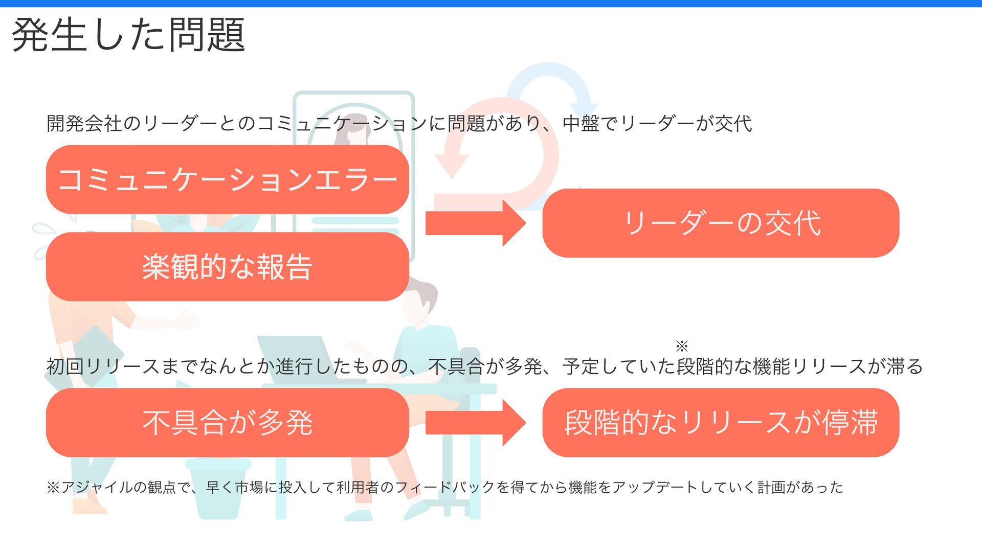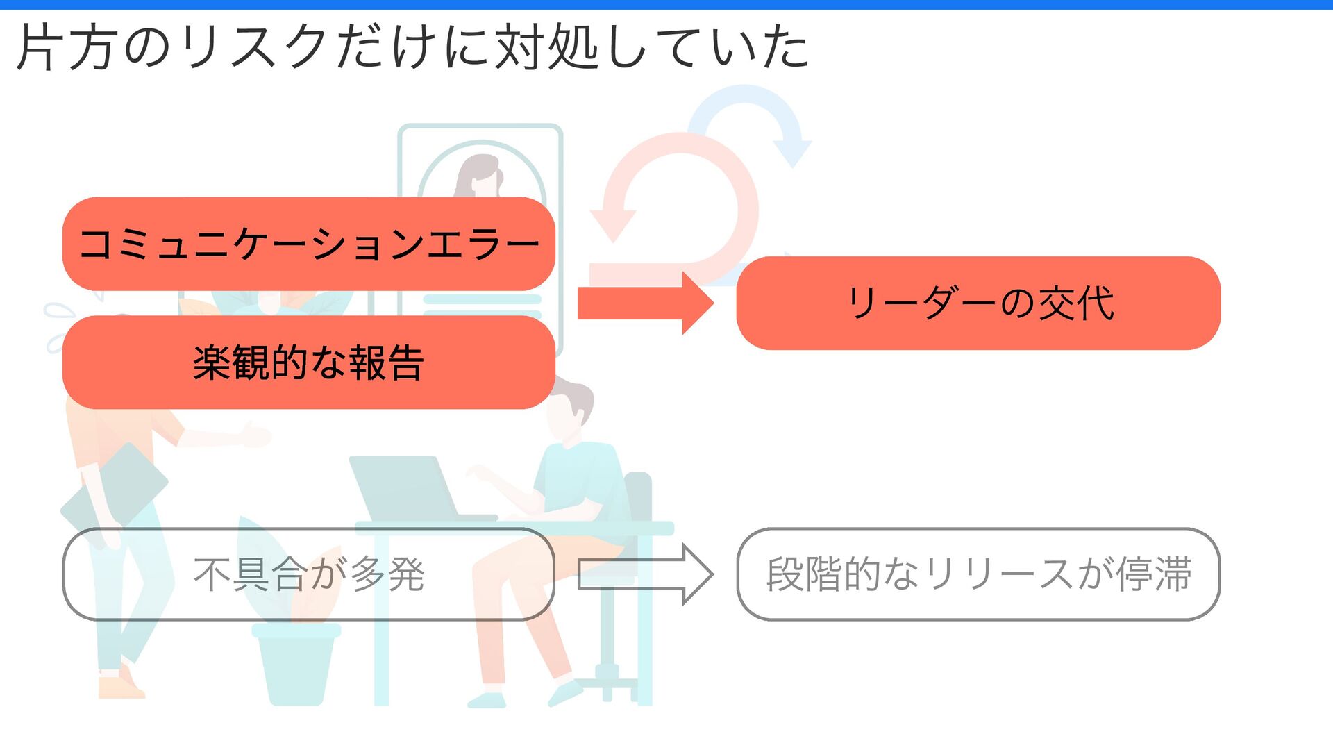 不具合が多発 段階的なリリースが停滞 コミュニケーションエラー 楽観的な報告 リーダーの交代 片方のリスクだけに対処していた