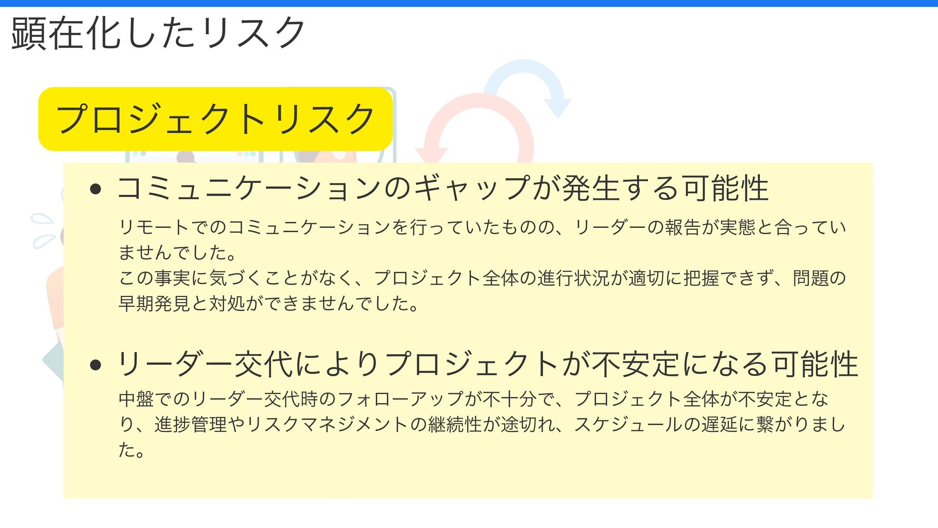 コミュニケーションのギャップが発生する可能性 リーダー交代によりプロジェクトが不安定になる可能性 顕在化したリスク プロジェクトリスク リモートでのコミュニケーションを行っていたものの、リーダーの報告が実態と合ってい ませんでした。 この事実に気づくことがなく、プロジェクト全体の進行状況が適切に把握できず、問題の 早期発見と対処ができませんでした。 中盤でのリーダー交代時のフォローアップが不十分で、プロジェクト全体が不安定とな
