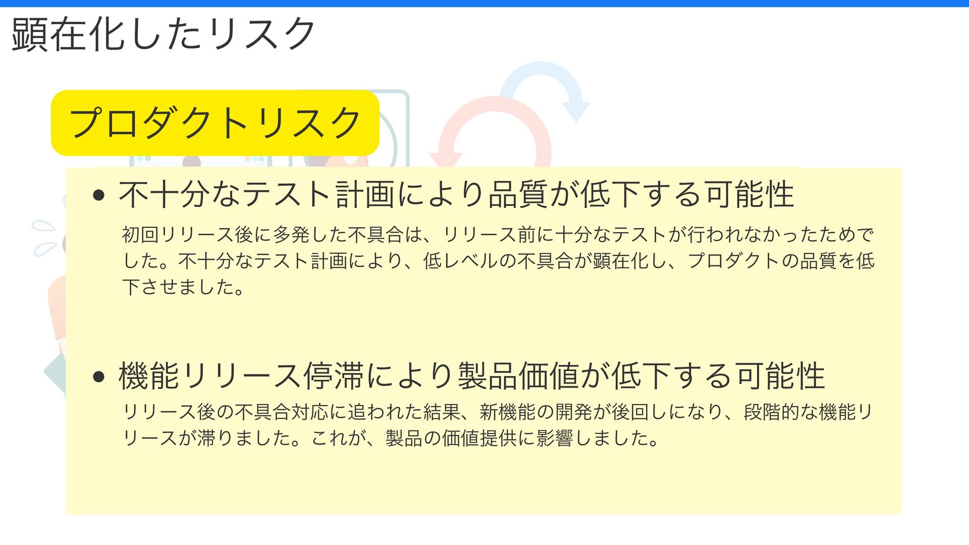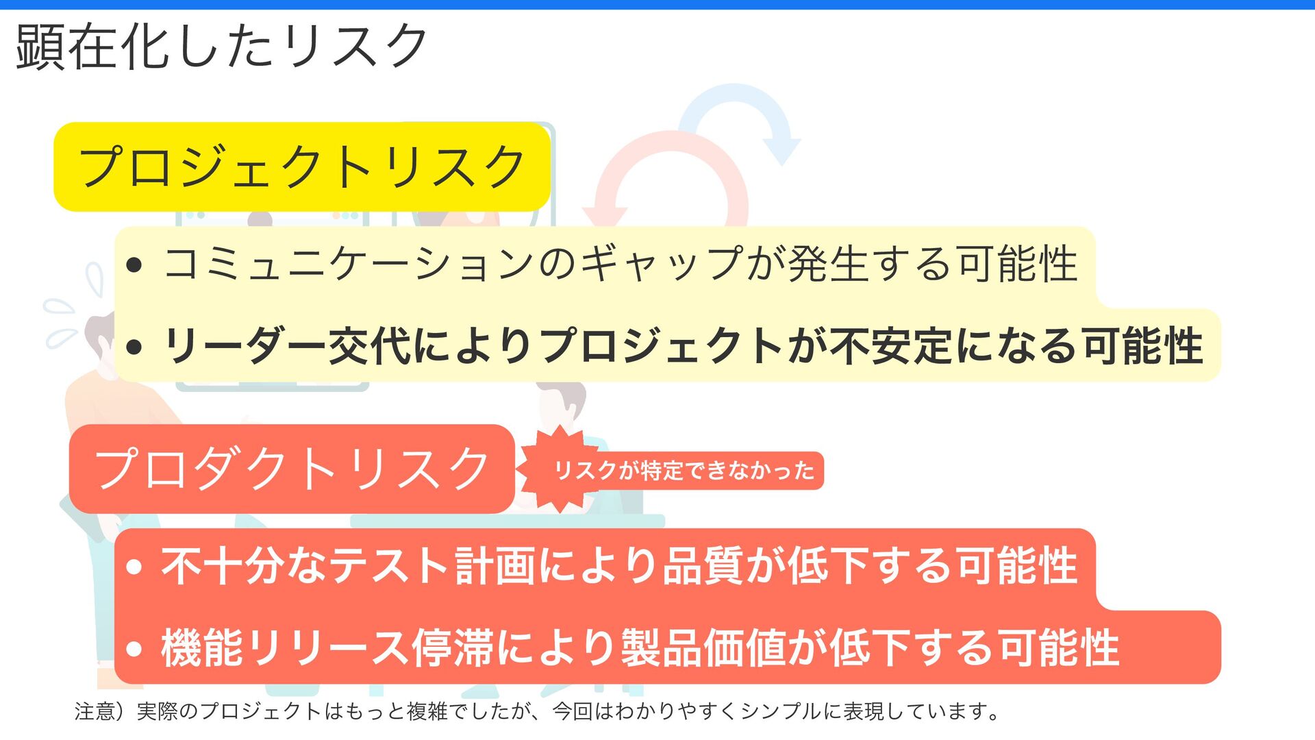 コミュニケーションのギャップが発生する可能性 リーダー交代によりプロジェクトが不安定になる可能性 不十分なテスト計画により品質が低下する可能性 機能リリース停滞により製品価値が低下する可能性 顕在化したリスク プロジェクトリスク プロダクトリスク 注意)実際のプロジェクトはもっと複雑でしたが、今回はわかりやすくシンプルに表現しています。 リスクが特定できなかった