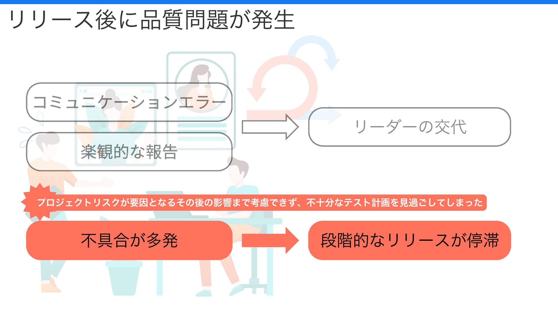 コミュニケーションエラー 楽観的な報告 リーダーの交代 リリース後に品質問題が発生 不具合が多発 段階的なリリースが停滞 プロジェクトリスクが要因となるその後の影響まで考慮できず、不十分なテスト計画を見過ごしてしまった
