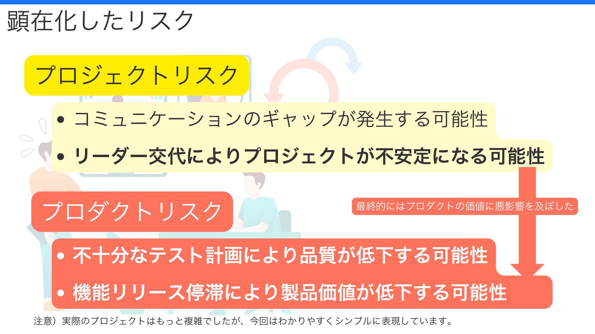 コミュニケーションのギャップが発生する可能性 リーダー交代によりプロジェクトが不安定になる可能性 不十分なテスト計画により品質が低下する可能性 機能リリース停滞により製品価値が低下する可能性 顕在化したリスク プロジェクトリスク プロダクトリスク 注意)実際のプロジェクトはもっと複雑でしたが、今回はわかりやすくシンプルに表現しています。 最終的にはプロダクトの価値に悪影響を及ぼした