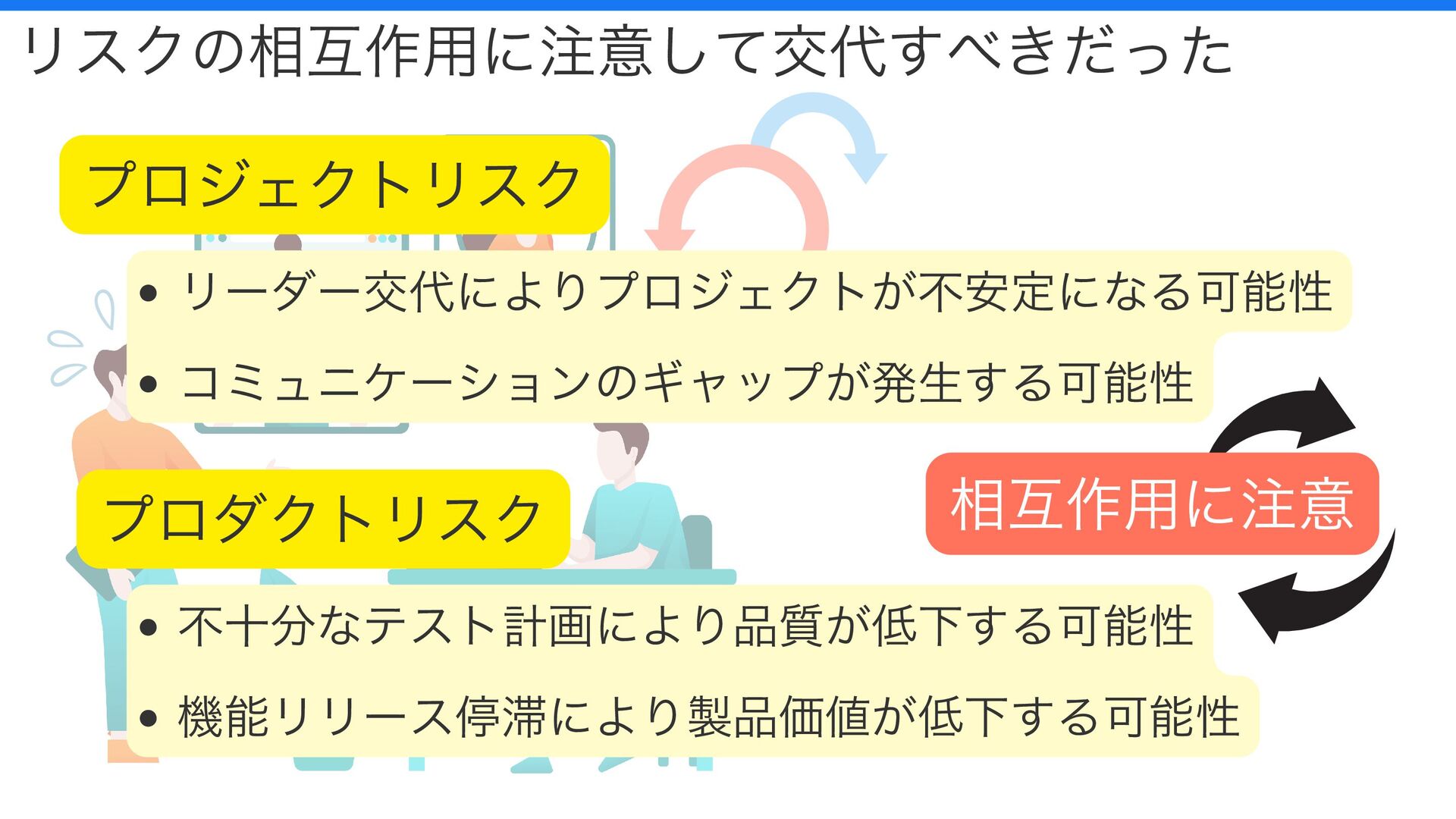 リスクの相互作用に注意して交代すべきだった プロジェクトリスク プロダクトリスク リーダー交代によりプロジェクトが不安定になる可能性 コミュニケーションのギャップが発生する可能性 不十分なテスト計画により品質が低下する可能性 機能リリース停滞により製品価値が低下する可能性 相互作用に注意