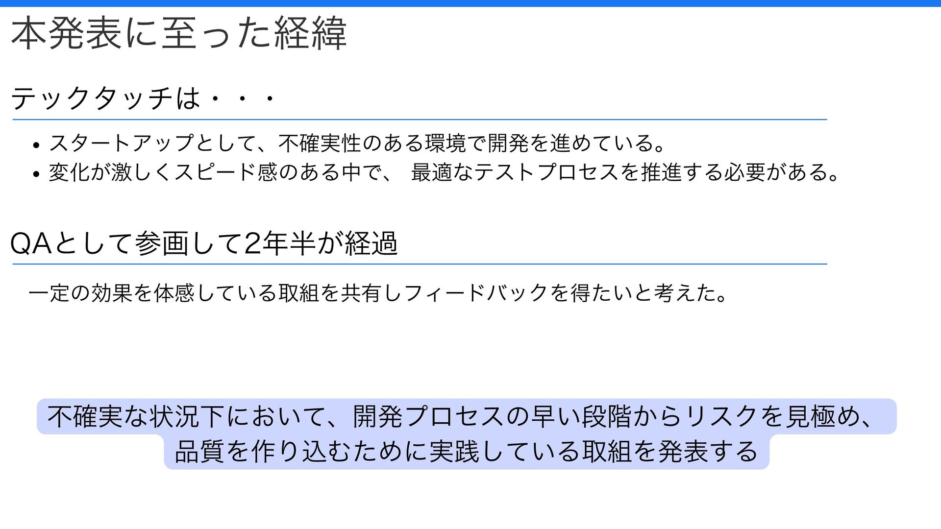 本発表に至った経緯 スタートアップとして、不確実性のある環境で開発を進めている。 変化が激しくスピード感のある中で、 最適なテストプロセスを推進する必要がある。 不確実な状況下において、開発プロセスの早い段階からリスクを見極め、 品質を作り込むために実践している取組を発表する 一定の効果を体感している取組を共有しフィードバックを得たいと考えた。 テックタッチは・・・ QAとして参画して2年半が経過
