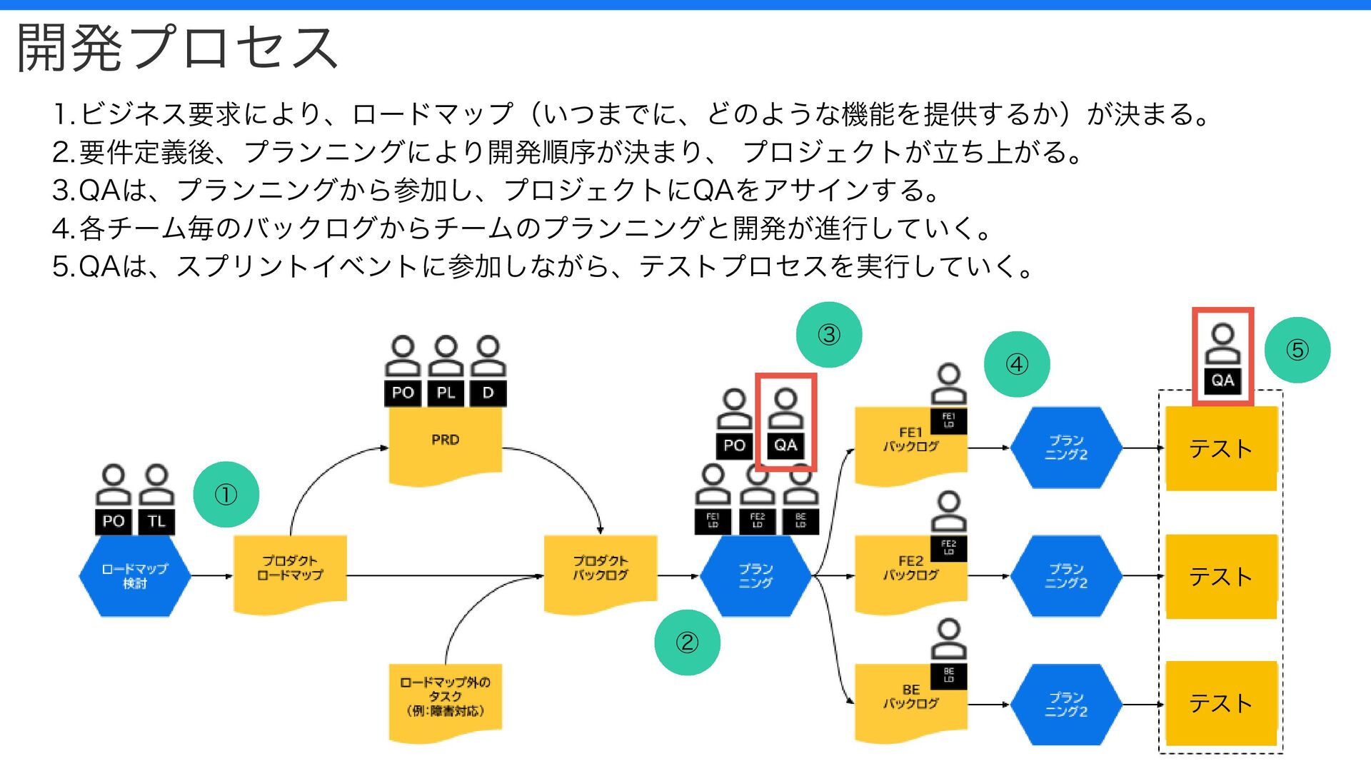 開発プロセス 1.ビジネス要求により、ロードマップ(いつまでに、どのような機能を提供するか)が決まる。 2.要件定義後、プランニングにより開発順序が決まり、 プロジェクトが立ち上がる。 3.QAは、プランニングから参加し、プロジェクトにQAをアサインする。 4.各チーム毎のバックログからチームのプランニングと開発が進行していく。 5.QAは、スプリントイベントに参加しながら、テストプロセスを実行していく。 ② ④ ③