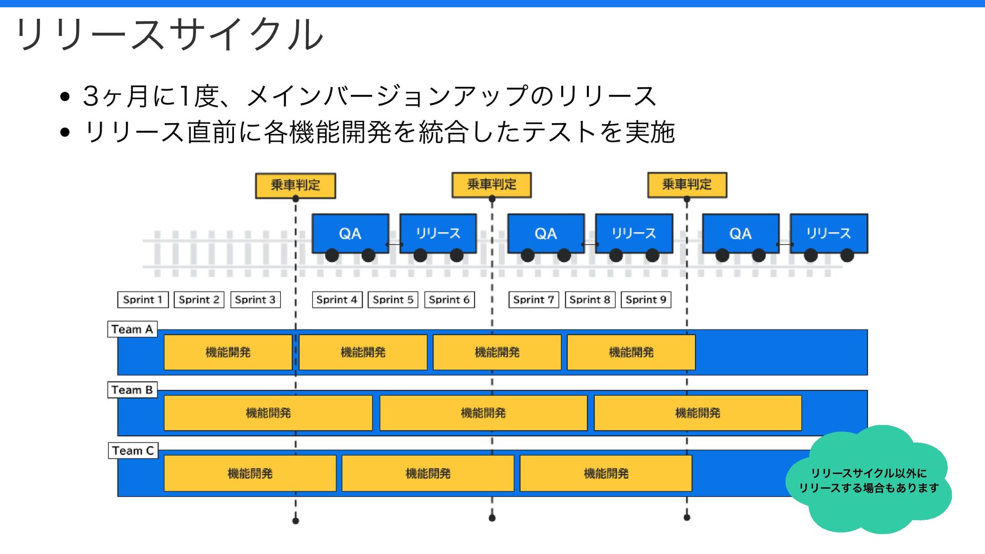 リリースサイクル以外に リリースする場合もあります リリースサイクル 3ヶ月に1度、メインバージョンアップのリリース リリース直前に各機能開発を統合したテストを実施