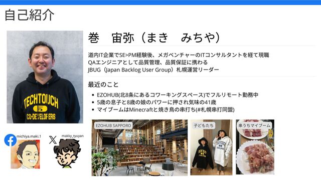 User Group )札幌運営リーダー michiya.maki.1 makky_tyuyan EZOHUB( 北8 条にあるコワーキングスペース) でフルリモート勤務中 5 歳の息子と8 歳の娘のパワーに押され気味の41 歳 マイブームはMinecraft と焼き鳥の串打ち(# 札幌串打同盟) 最近のこと EZOHUB SAPPORO 自己紹介 子どもたち 串うちマイブーム