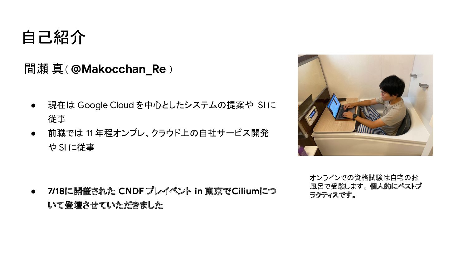 SI に 従事 • 前職では 11 年程オンプレ、クラウド上の自社サービス開発 や SI に従事 • 7/18に開催された CNDF プレイベント in 東京でCiliumにつ いて登壇させていただきました オンラインでの資格試験は自宅のお 風呂で受験します。 個人的にベストプ ラクティスです。