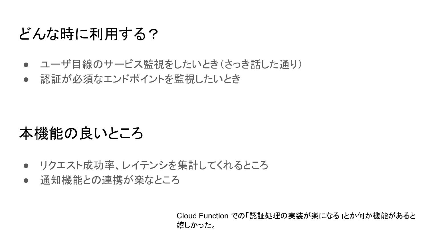 Cloud Function での「認証処理の実装が楽になる」とか何か機能があると 嬉しかった。