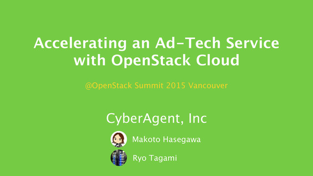 2015.04 Kilo We used OpenStack only for PoC We provided over 10 services on OpenStack Grizzly (10+ compute nodes / 10 engineers) 2013.10 Ad-Tech Division started in CyberAgent 2014.06 We provided some Ad-Tech services on OpenStack Icehouse (40+ compute nodes / 3 engineers) 2015.03 We provided some Ad-Tech services on OpenStack Juno (100+ compute nodes / 3 engineers) We will start testing so very soon