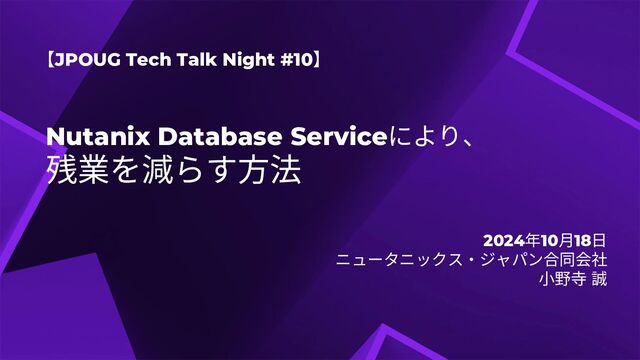 Nutanix Database Service(NDB)は、プライベートのデータセンター、パブリッククラウド、コロケーション、エッジなどを含むハイブリッド・マルチクラウドで、データベースの管理と利用をシンプルにし、サービスとしてのデータベース(DaaS)を実現します。 このNDBの活用により、みなさんの残業が減ってプライベートライフがより充実する方法をお話します。