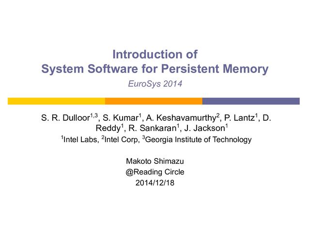 Circle 2014/12/18 S. R. Dulloor1,3, S. Kumar1, A. Keshavamurthy2, P. Lantz1, D. Reddy1, R. Sankaran1, J. Jackson1 1Intel Labs, 2Intel Corp, 3Georgia Institute of Technology EuroSys 2014