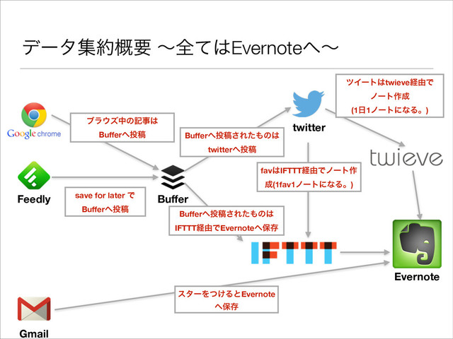 Bufferߘ Gmail ελʔΛ͚ͭΔͱEvernote อଘ ϒϥζதͷهࣄ Bufferߘ πΠʔτtwieveܦ༝Ͱ ϊʔτ࡞ (11ϊʔτʹͳΔɻ) favIFTTTܦ༝Ͱϊʔτ࡞ (1fav1ϊʔτʹͳΔɻ) Bufferߘ͞Εͨͷ twitterߘ Bufferߘ͞Εͨͷ IFTTTܦ༝ͰEvernoteอଘ