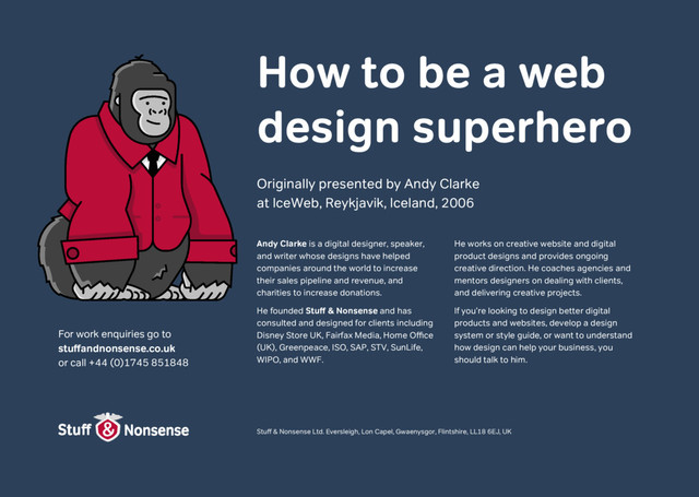 How to be a web design superhero Andy Clarke is a digital designer, speaker, and writer whose designs have helped companies around the world to increase their sales pipeline and revenue, and charities to increase donations. He founded Stuff & Nonsense and has consulted and designed for clients including Disney Store UK, Fairfax Media, Home Office (UK), Greenpeace, ISO, SAP, STV, SunLife, WIPO, and WWF. He works on creative website and digital product designs and provides ongoing creative direction. He coaches agencies and mentors designers on dealing with clients, and delivering creative projects. If you’re looking to design better digital products and websites, develop a design system or style guide, or want to understand how design can help your business, you should talk to him. Stuff & Nonsense Ltd. Eversleigh, Lon Capel, Gwaenysgor, Flintshire, LL18 6EJ, UK For work enquiries go to stuffandnonsense.co.uk or call +44 (0)1745 851848