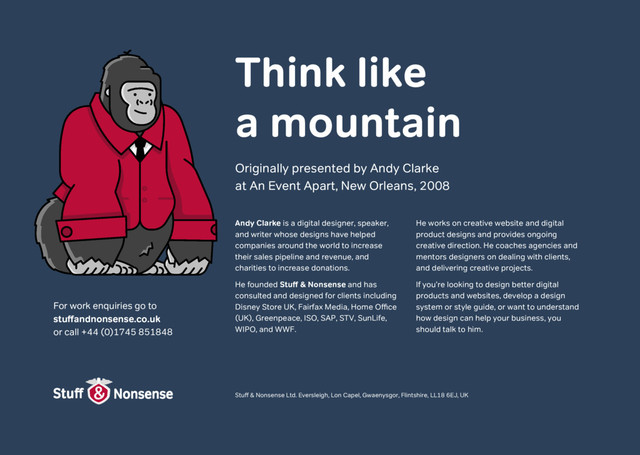 Orleans, 2008 Think like a mountain Andy Clarke is a digital designer, speaker, and writer whose designs have helped companies around the world to increase their sales pipeline and revenue, and charities to increase donations. He founded Stuff & Nonsense and has consulted and designed for clients including Disney Store UK, Fairfax Media, Home Office (UK), Greenpeace, ISO, SAP, STV, SunLife, WIPO, and WWF. He works on creative website and digital product designs and provides ongoing creative direction. He coaches agencies and mentors designers on dealing with clients, and delivering creative projects. If you’re looking to design better digital products and websites, develop a design system or style guide, or want to understand how design can help your business, you should talk to him. Stuff & Nonsense Ltd. Eversleigh, Lon Capel, Gwaenysgor, Flintshire, LL18 6EJ, UK For work enquiries go to stuffandnonsense.co.uk or call +44 (0)1745 851848