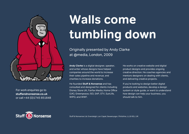 come tumbling down Andy Clarke is a digital designer, speaker, and writer whose designs have helped companies around the world to increase their sales pipeline and revenue, and charities to increase donations. He founded Stuff & Nonsense and has consulted and designed for clients including Disney Store UK, Fairfax Media, Home Office (UK), Greenpeace, ISO, SAP, STV, SunLife, WIPO, and WWF. He works on creative website and digital product designs and provides ongoing creative direction. He coaches agencies and mentors designers on dealing with clients, and delivering creative projects. If you’re looking to design better digital products and websites, develop a design system or style guide, or want to understand how design can help your business, you should talk to him. Stuff & Nonsense Ltd. Eversleigh, Lon Capel, Gwaenysgor, Flintshire, LL18 6EJ, UK For work enquiries go to stuffandnonsense.co.uk or call +44 (0)1745 851848