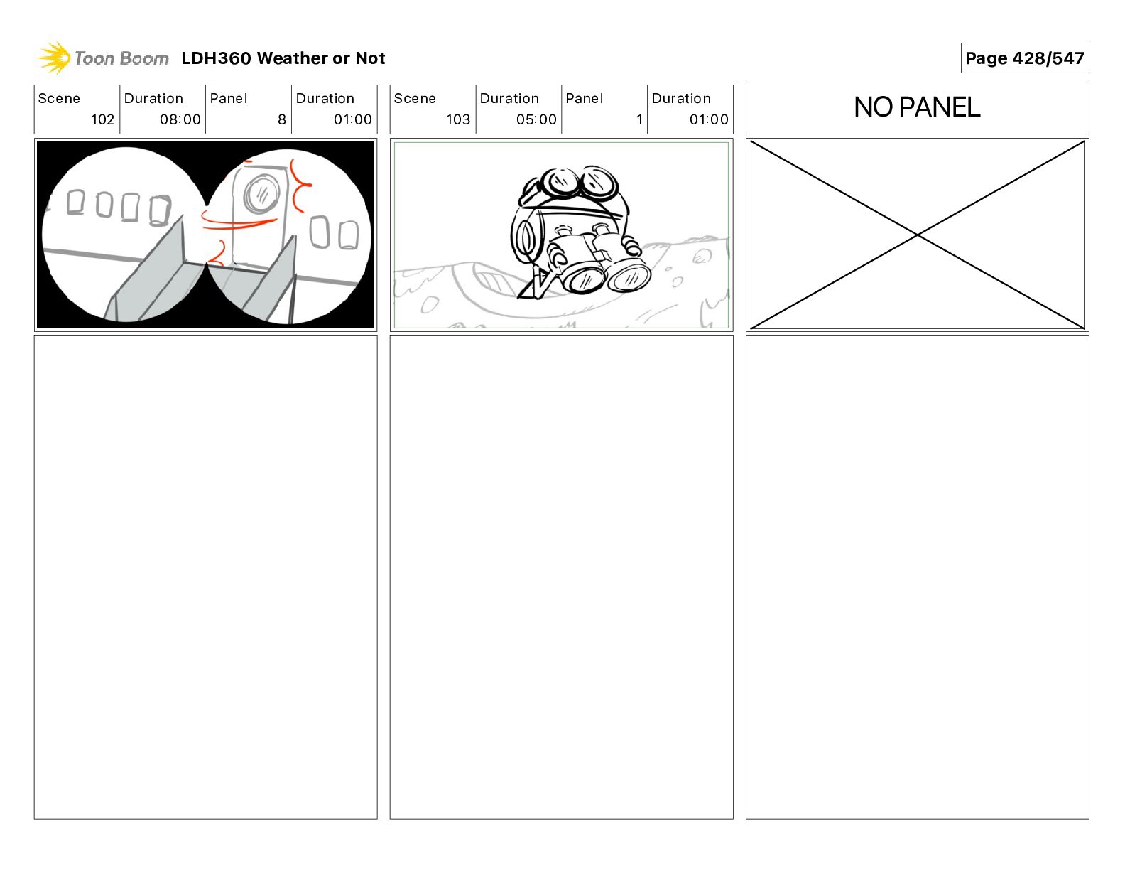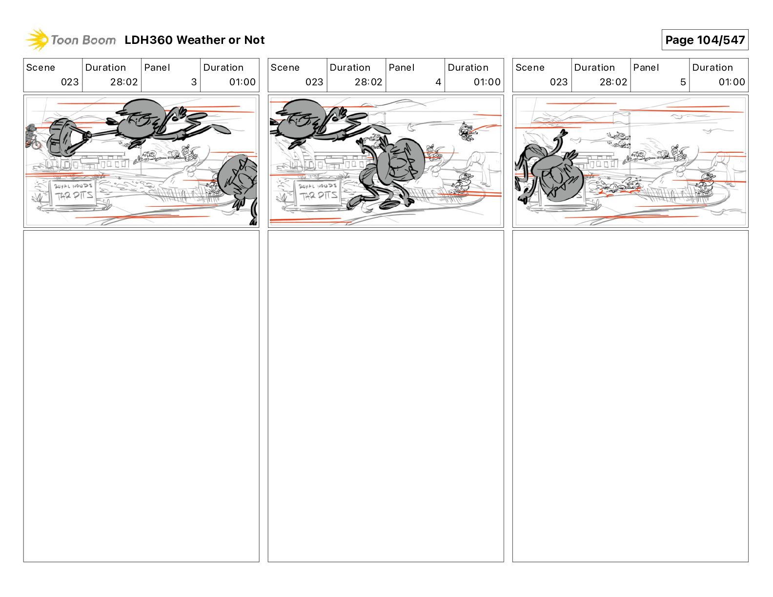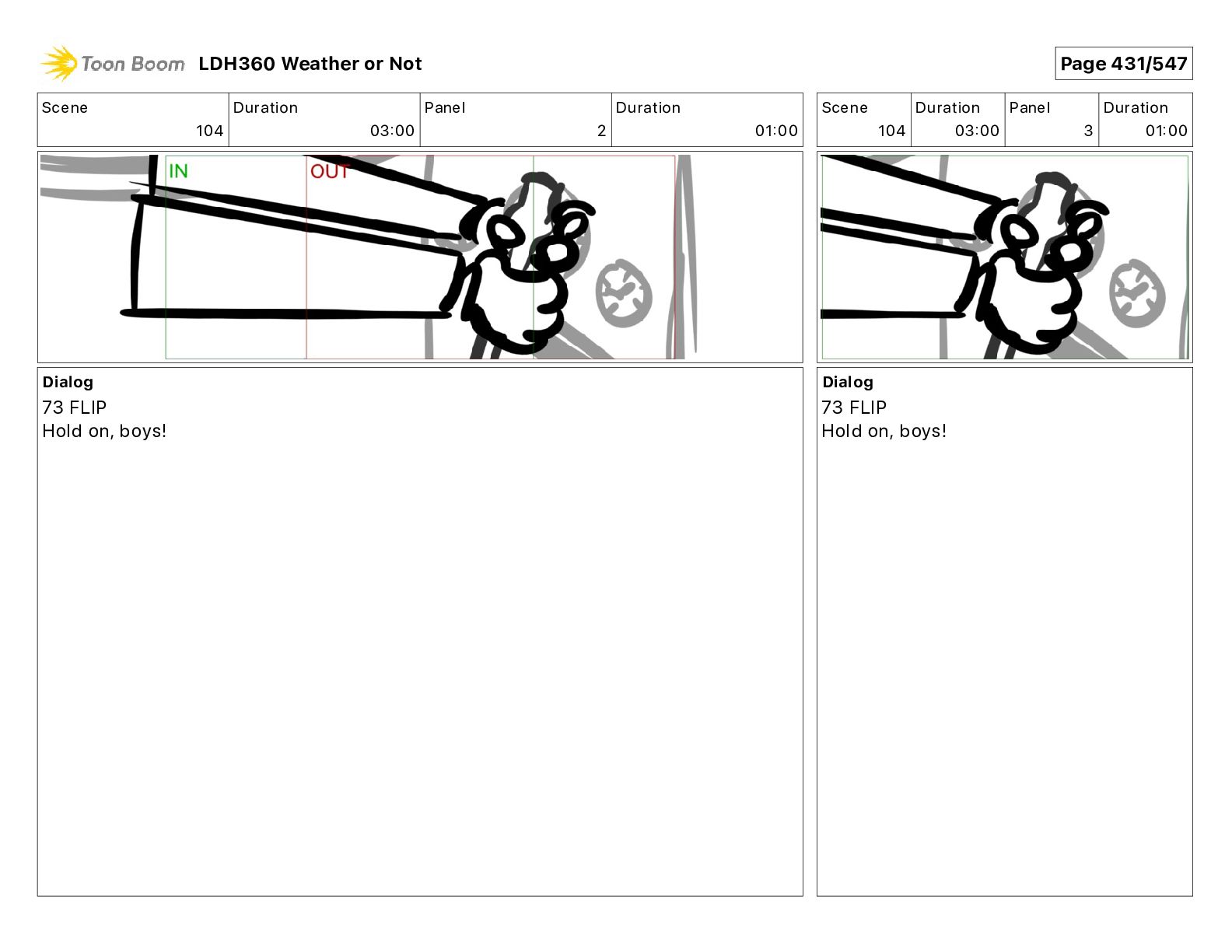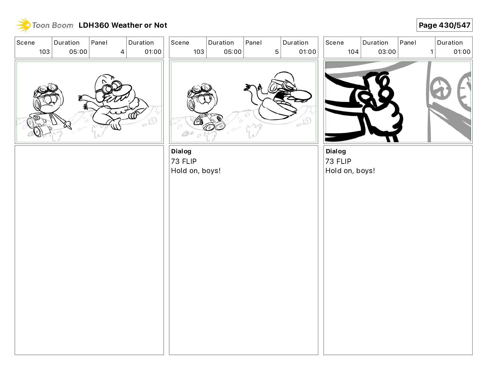 Scene 103 Duration 05 00 Panel 5 Duration 01 00 Dialog 73 FLIP Hold on, boys! Scene 104 Duration 03 00 Panel 1 Duration 01 00 Dialog 73 FLIP Hold on, boys! LDH360 Weather or Not Page 430/547