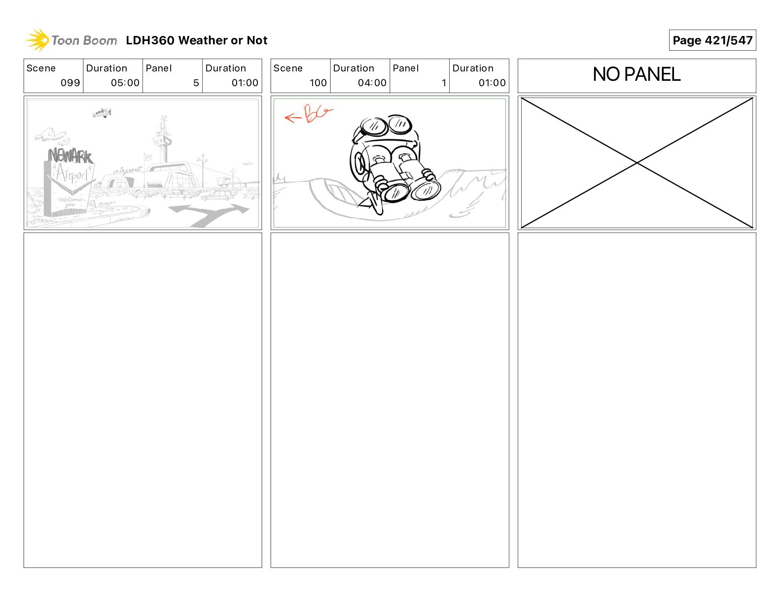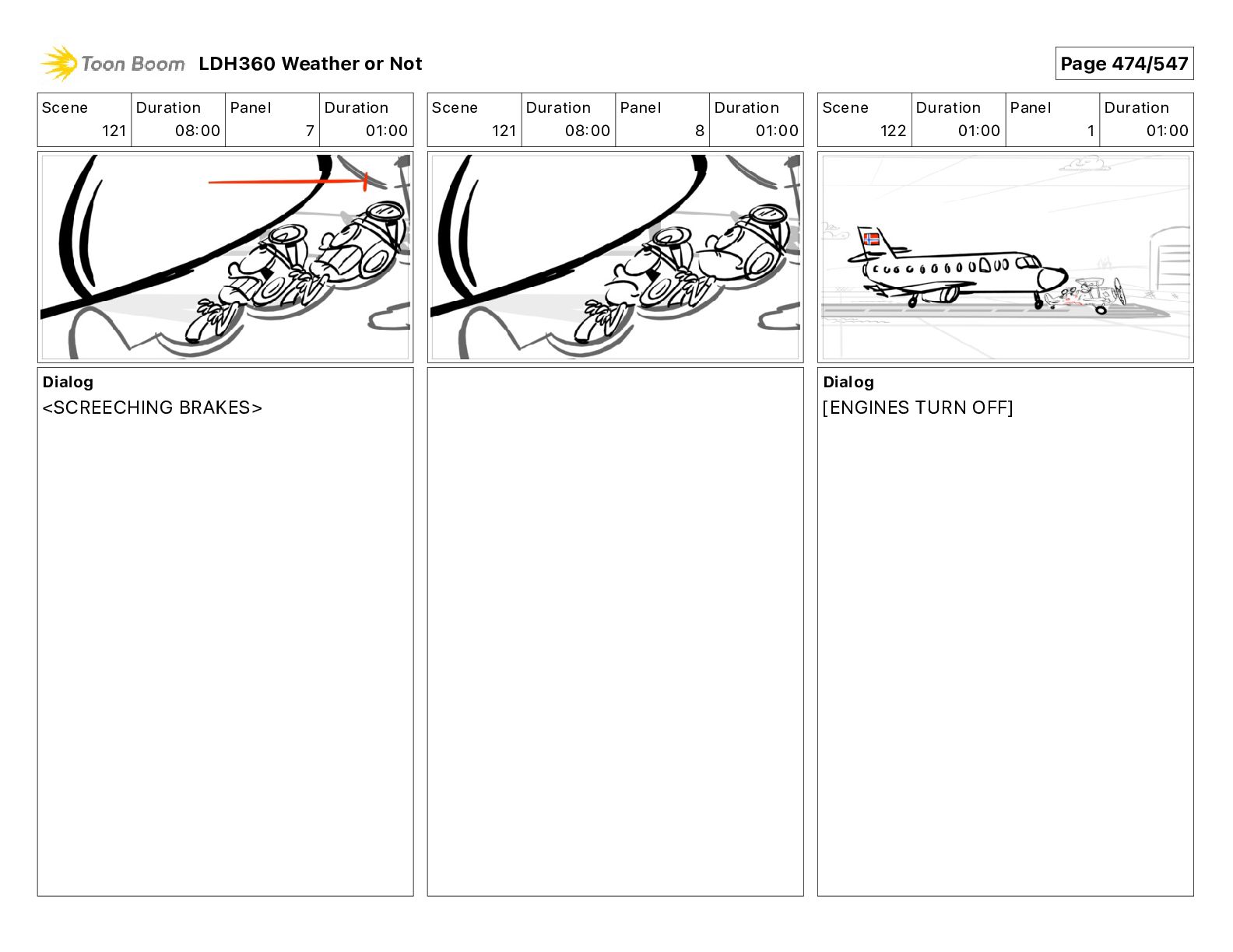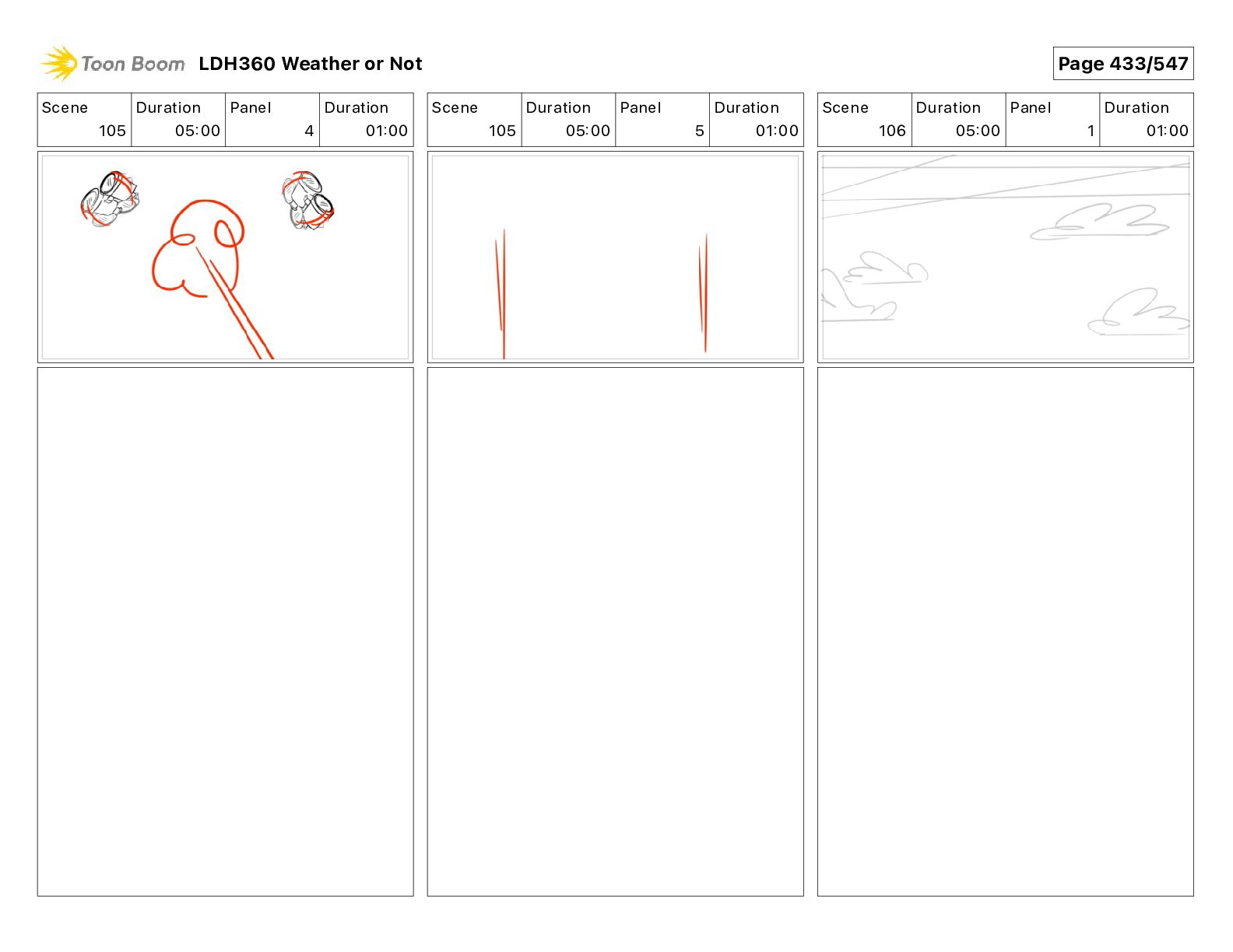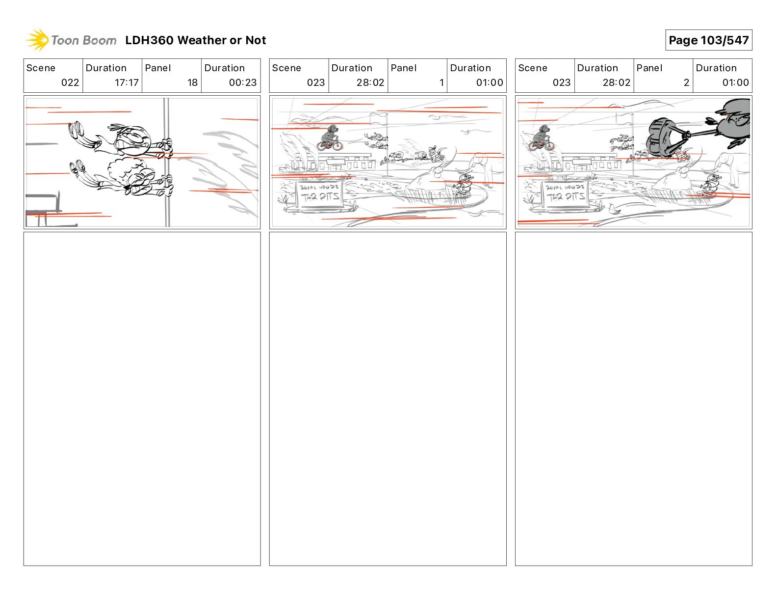Scene 103 Duration 05 00 Panel 5 Duration 01 00 Dialog 73 FLIP Hold on, boys! Scene 104 Duration 03 00 Panel 1 Duration 01 00 Dialog 73 FLIP Hold on, boys! LDH360 Weather or Not Page 430/547