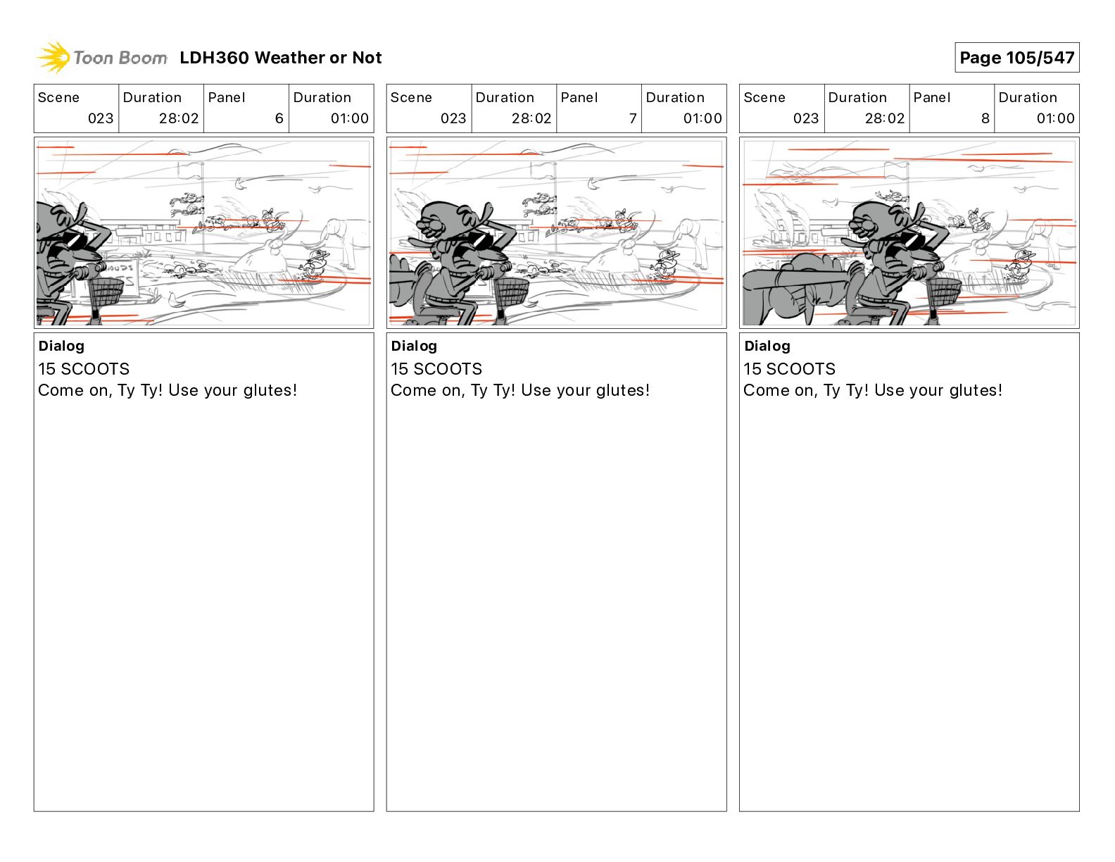 Dialog 15 SCOOTS Come on, Ty Ty! Use your glutes! Scene 023 Duration 28 02 Panel 7 Duration 01 00 Dialog 15 SCOOTS Come on, Ty Ty! Use your glutes! Scene 023 Duration 28 02 Panel 8 Duration 01 00 Dialog 15 SCOOTS Come on, Ty Ty! Use your glutes! LDH360 Weather or Not Page 105/547