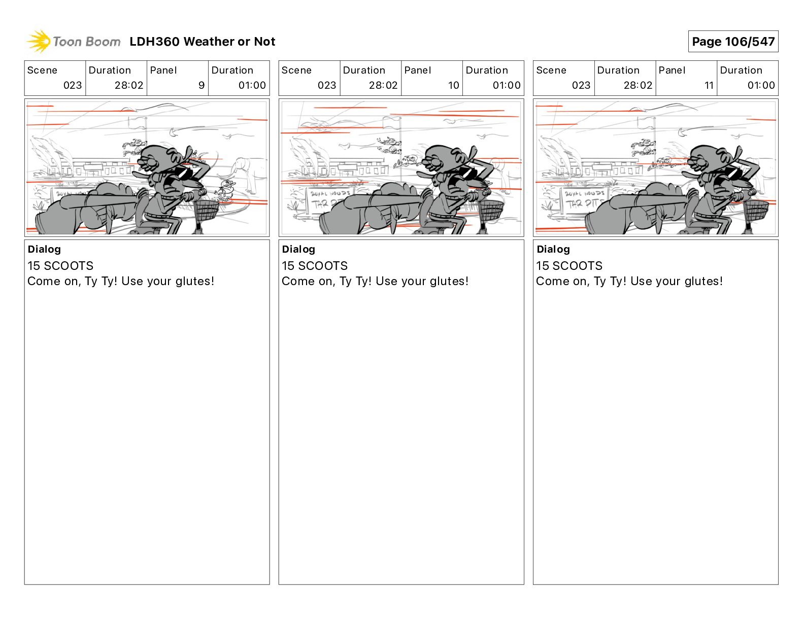 Dialog 15 SCOOTS Come on, Ty Ty! Use your glutes! Scene 023 Duration 28 02 Panel 10 Duration 01 00 Dialog 15 SCOOTS Come on, Ty Ty! Use your glutes! Scene 023 Duration 28 02 Panel 11 Duration 01 00 Dialog 15 SCOOTS Come on, Ty Ty! Use your glutes! LDH360 Weather or Not Page 106/547