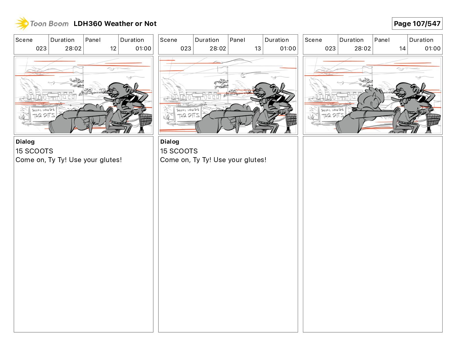 Dialog 15 SCOOTS Come on, Ty Ty! Use your glutes! Scene 023 Duration 28 02 Panel 13 Duration 01 00 Dialog 15 SCOOTS Come on, Ty Ty! Use your glutes! Scene 023 Duration 28 02 Panel 14 Duration 01 00 LDH360 Weather or Not Page 107/547