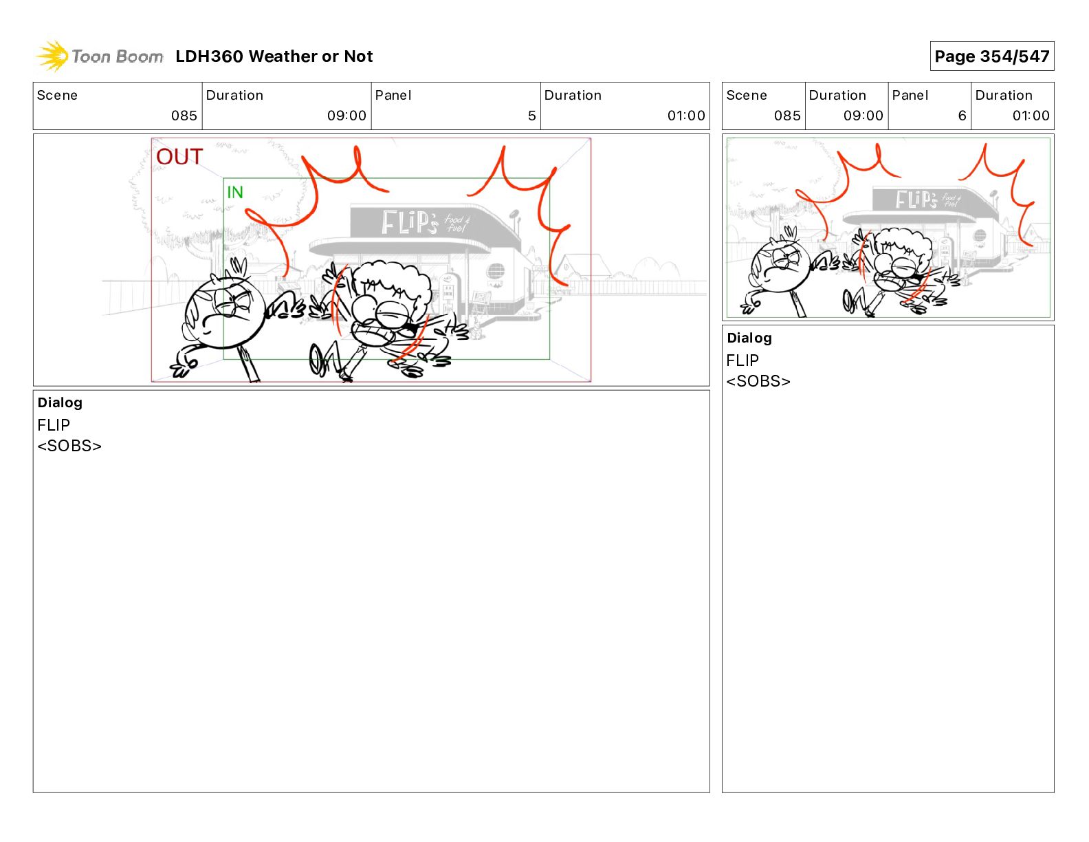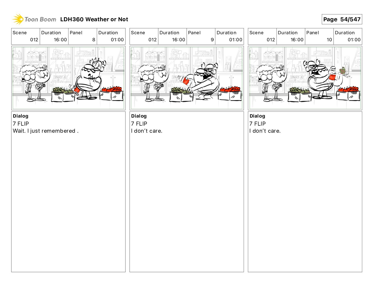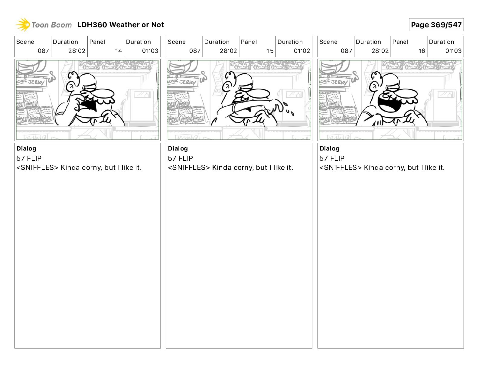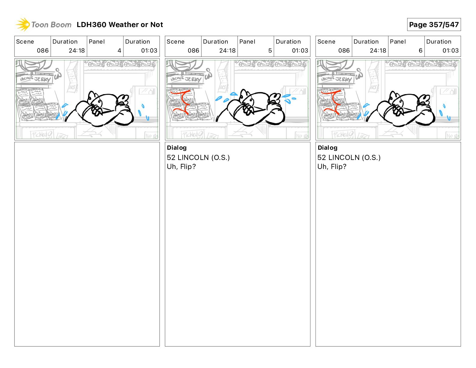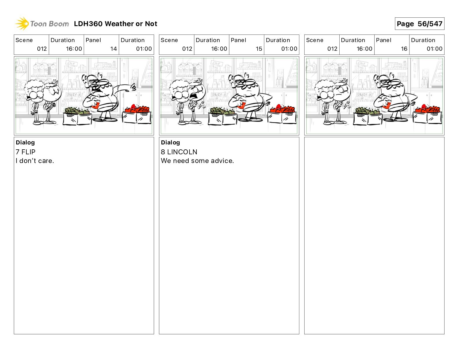 Dialog 7 FLIP I donʼt care. Scene 012 Duration 16 00 Panel 15 Duration 01 00 Dialog 8 LINCOLN We need some advice. Scene 012 Duration 16 00 Panel 16 Duration 01 00 LDH360 Weather or Not Page 56/547