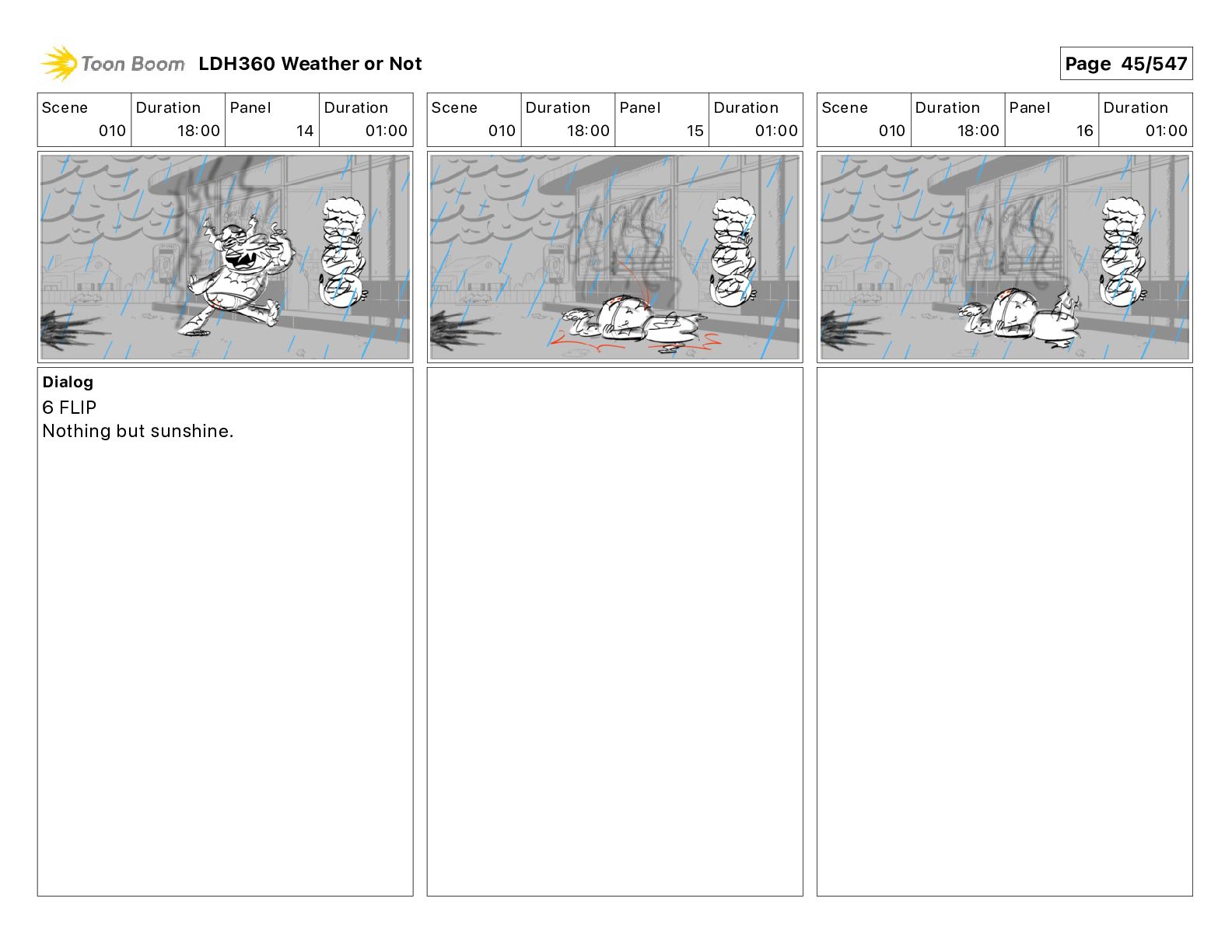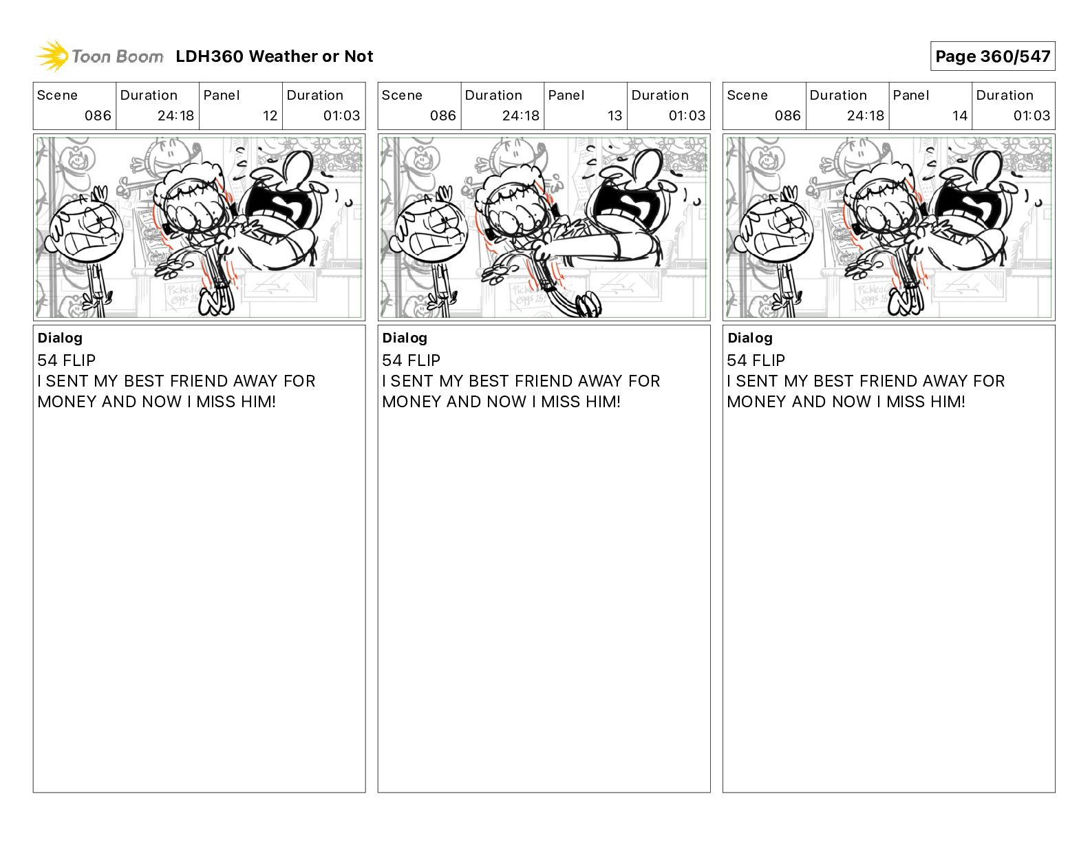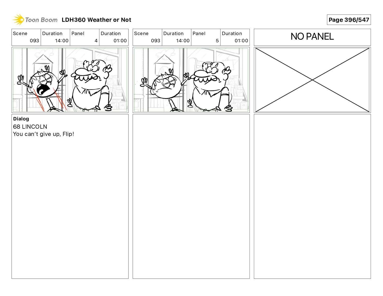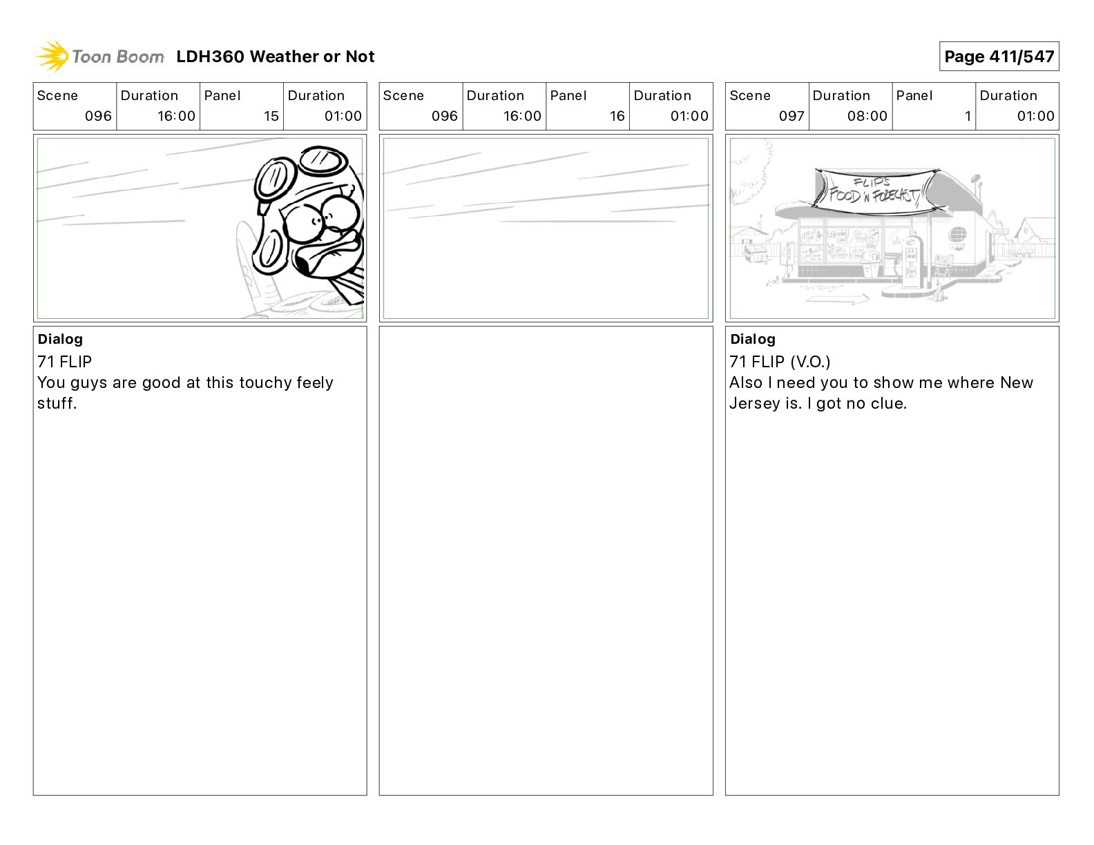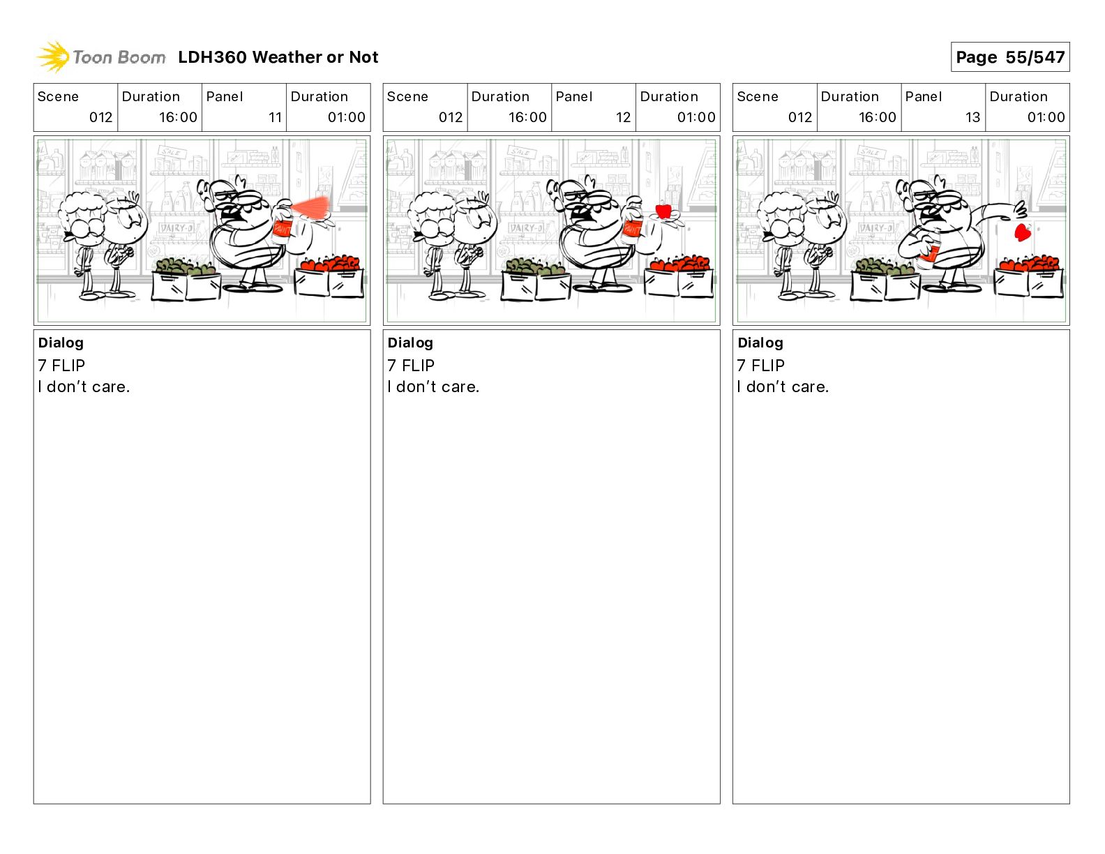 Dialog 7 FLIP I donʼt care. Scene 012 Duration 16 00 Panel 15 Duration 01 00 Dialog 8 LINCOLN We need some advice. Scene 012 Duration 16 00 Panel 16 Duration 01 00 LDH360 Weather or Not Page 56/547